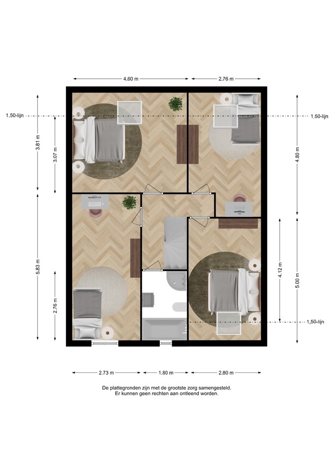 De overloop biedt toegang tot vier ruime slaapkamers, allemaal strak afgewerkt en voorzien van een nette vloer.