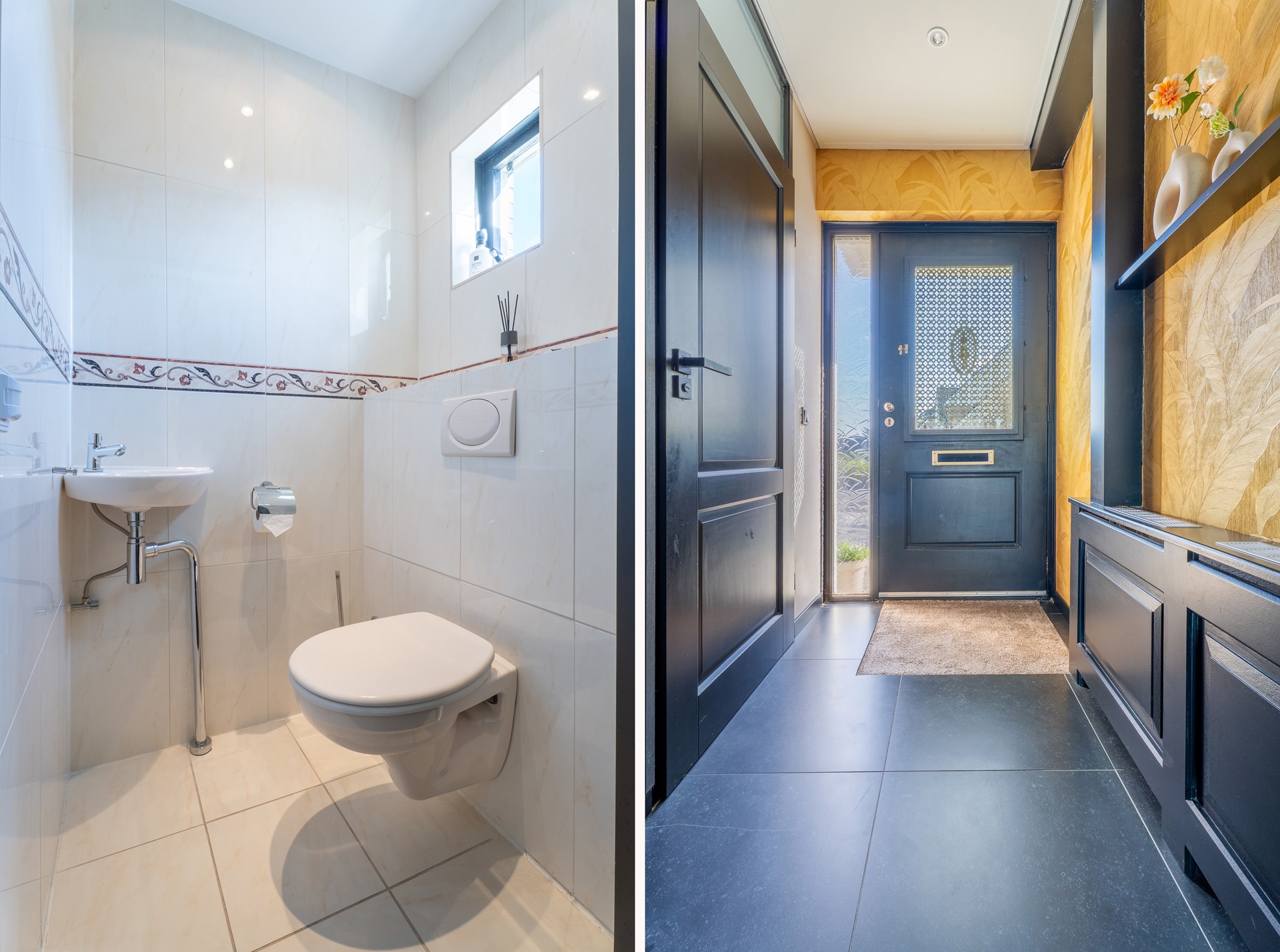 In de hal bevinden zich de meterkast, het moderne toilet, de trapopgang en de toegang tot de garage en woonkamer. De garage is voorzien van een elektrische garagedeur.