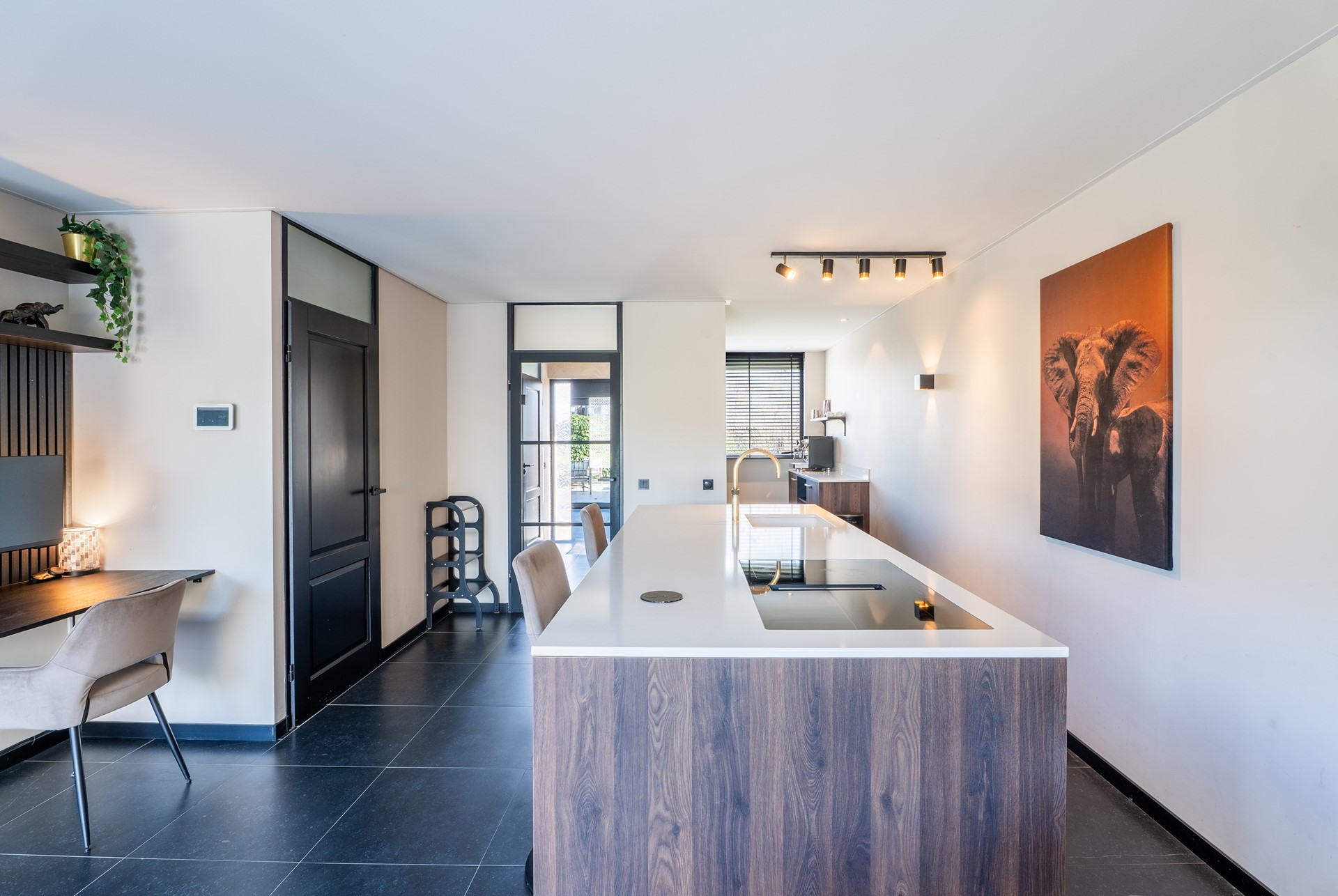 De luxe open keuken (2021) is een echte eyecatcher en uitgevoerd met een kookeiland voorzien van een inductiekookplaat met geïntegreerde afzuiging, Quooker en vaatwasser. De apparatenwand beschikt over een koelkast, oven, magnetron en veel opbergruimte.
