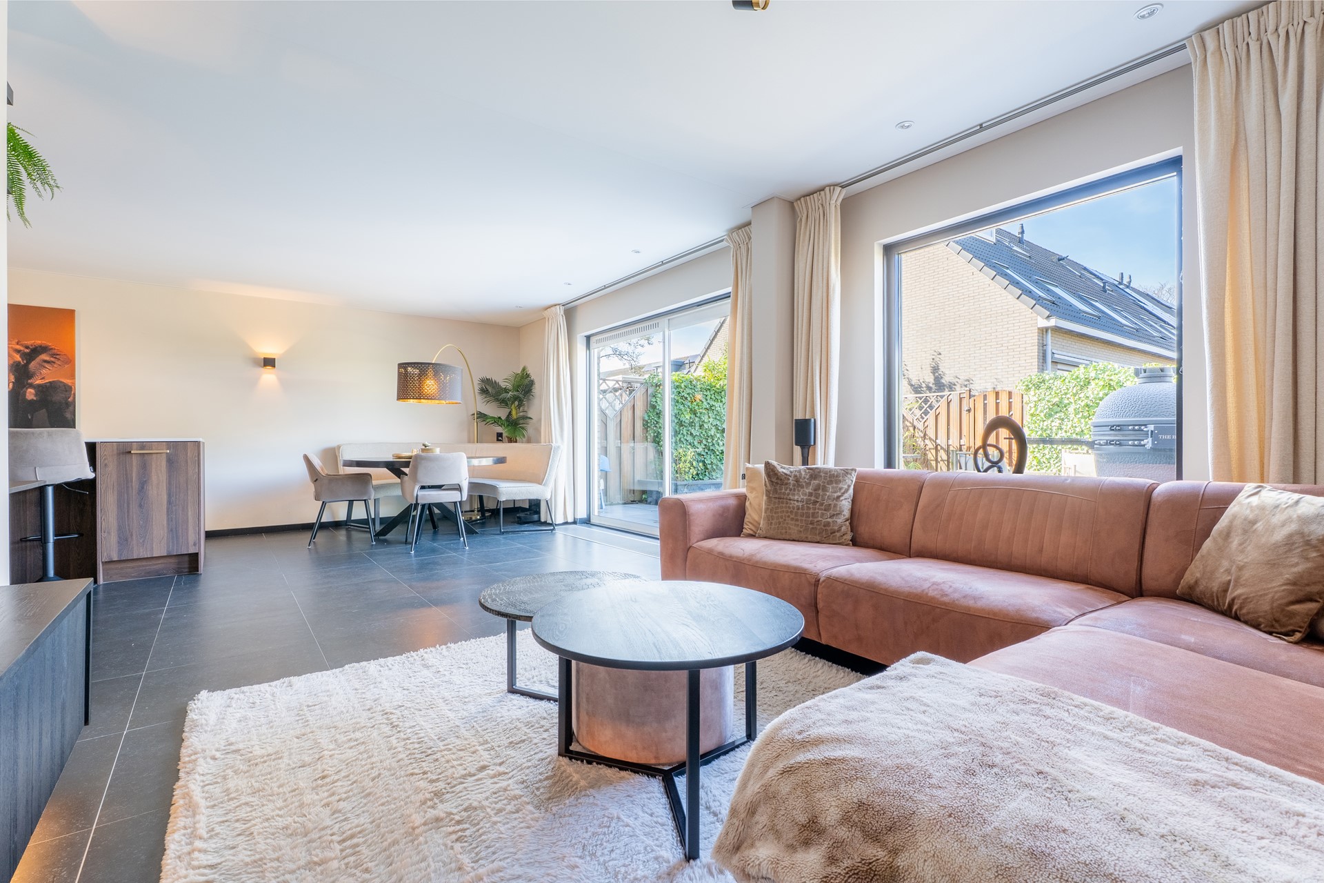 De woonkamer is verrassend ruim dankzij de uitbouw achter de garage en is afgewerkt met een keramische tegelvloer met vloerverwarming. De grote schuifpui zorgt voor veel lichtinval en geeft direct toegang tot de achtertuin.