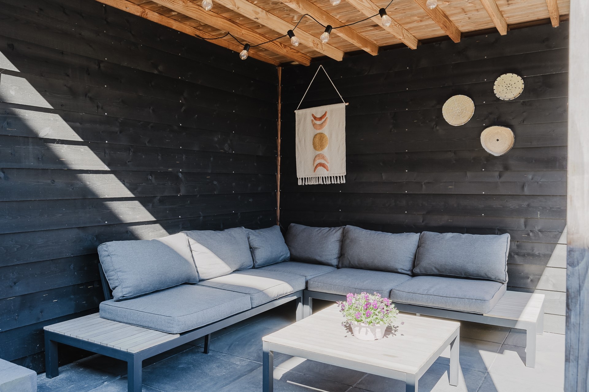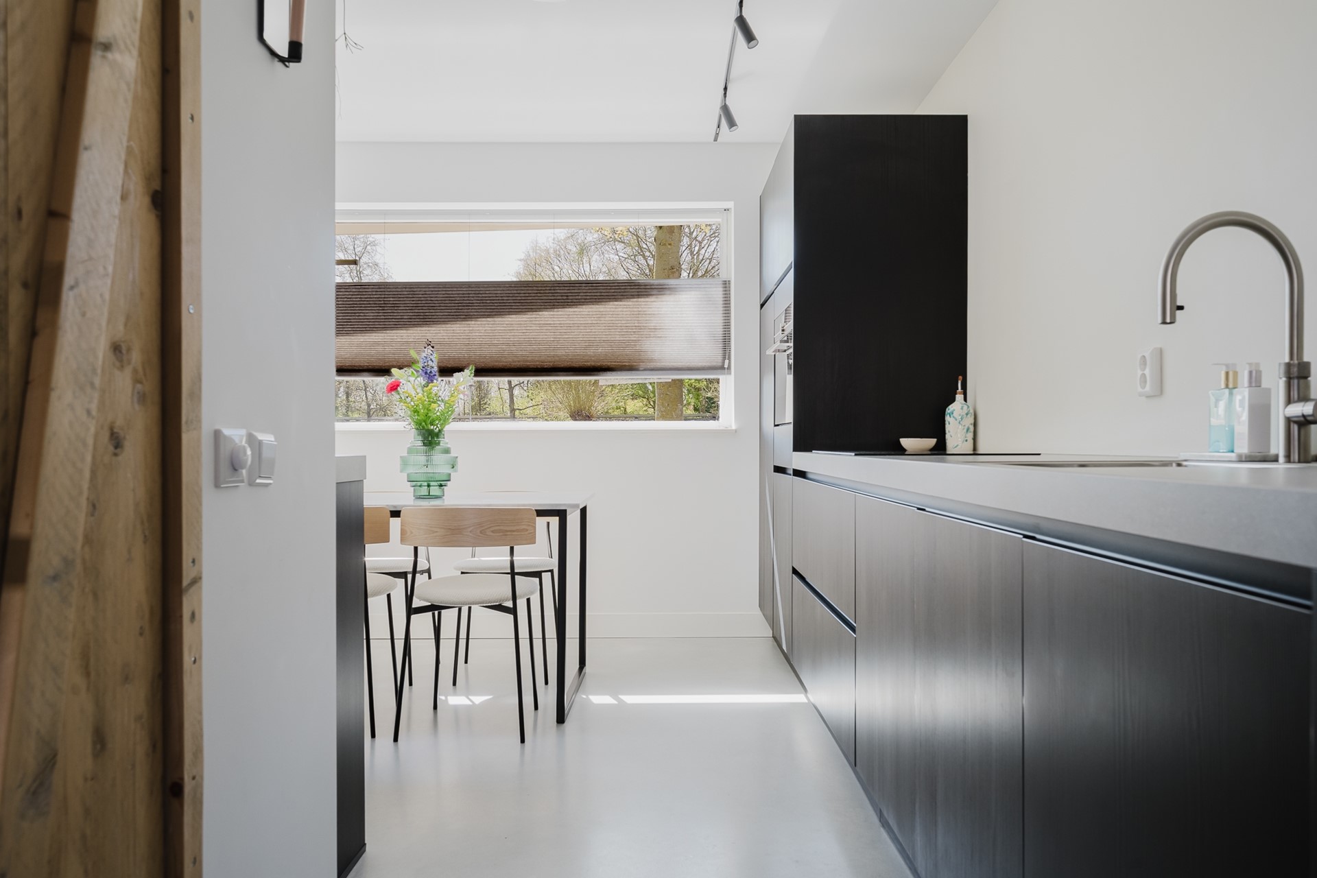 Via een stijlvolle taatsdeur bereik je de woonkamer. De begane grond is strak afgewerkt met een betonnen gietvloer en voorzien van vloerverwarming. De wanden zijn glad gestuct, wat zorgt voor een moderne en rustige uitstraling.