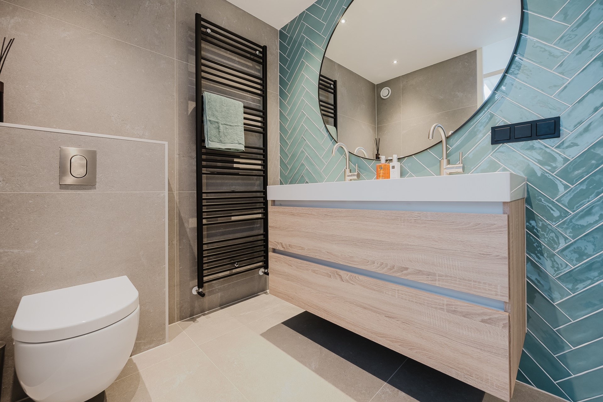 De luxe badkamer is een echte eyecatcher en voorzien van een dubbele inloopdouche, dubbele wastafel met meubel, verwarmde spiegel, toilet en mechanische ventilatie.