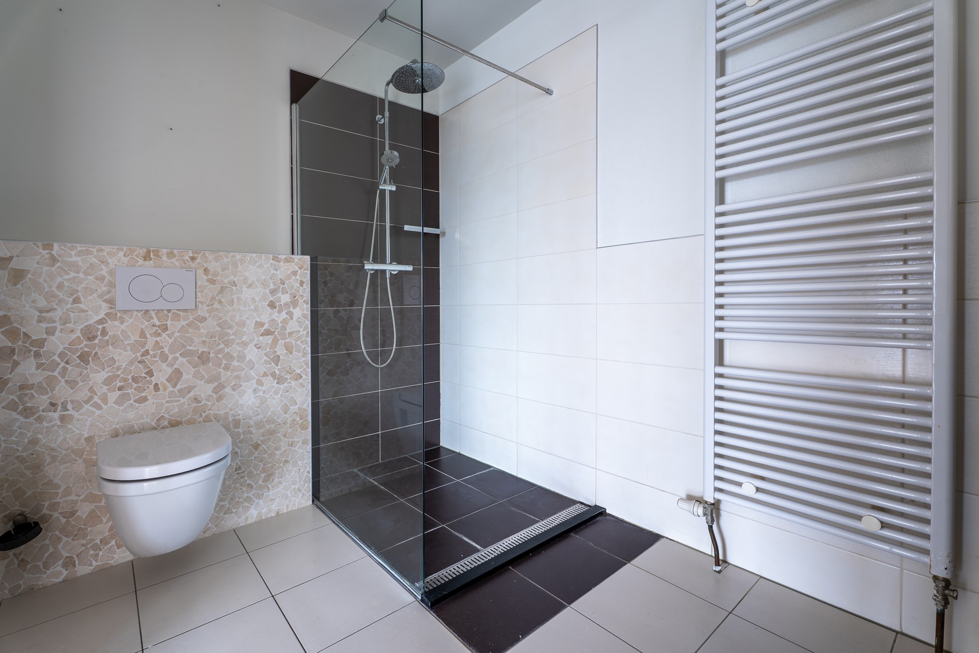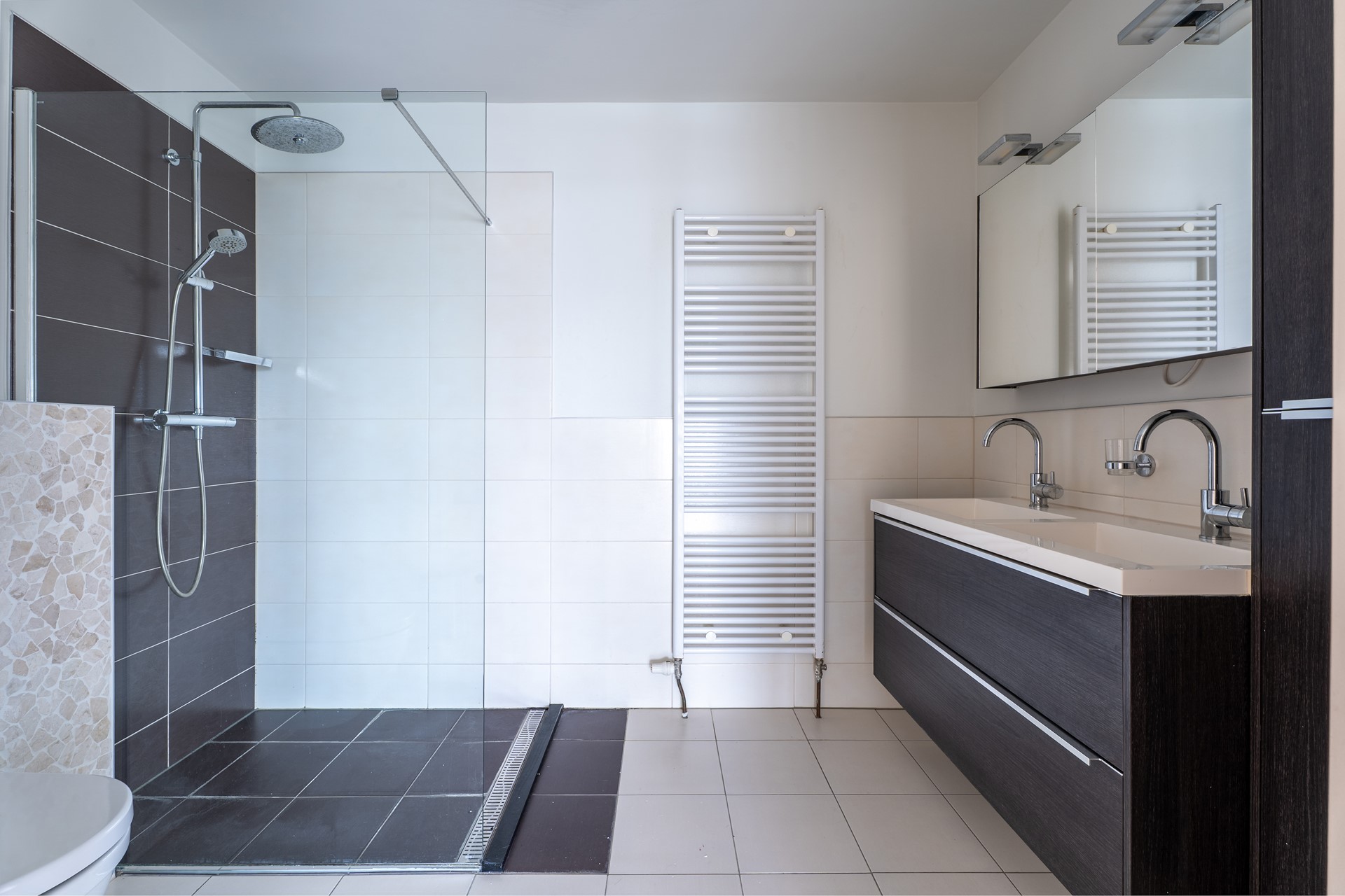 Via de hal bereik je de moderne badkamer. De badkamer is volledig betegeld en is voorzien van een dubbele wastafel met meubel, een ruime inloopdouche en een hangend toilet.