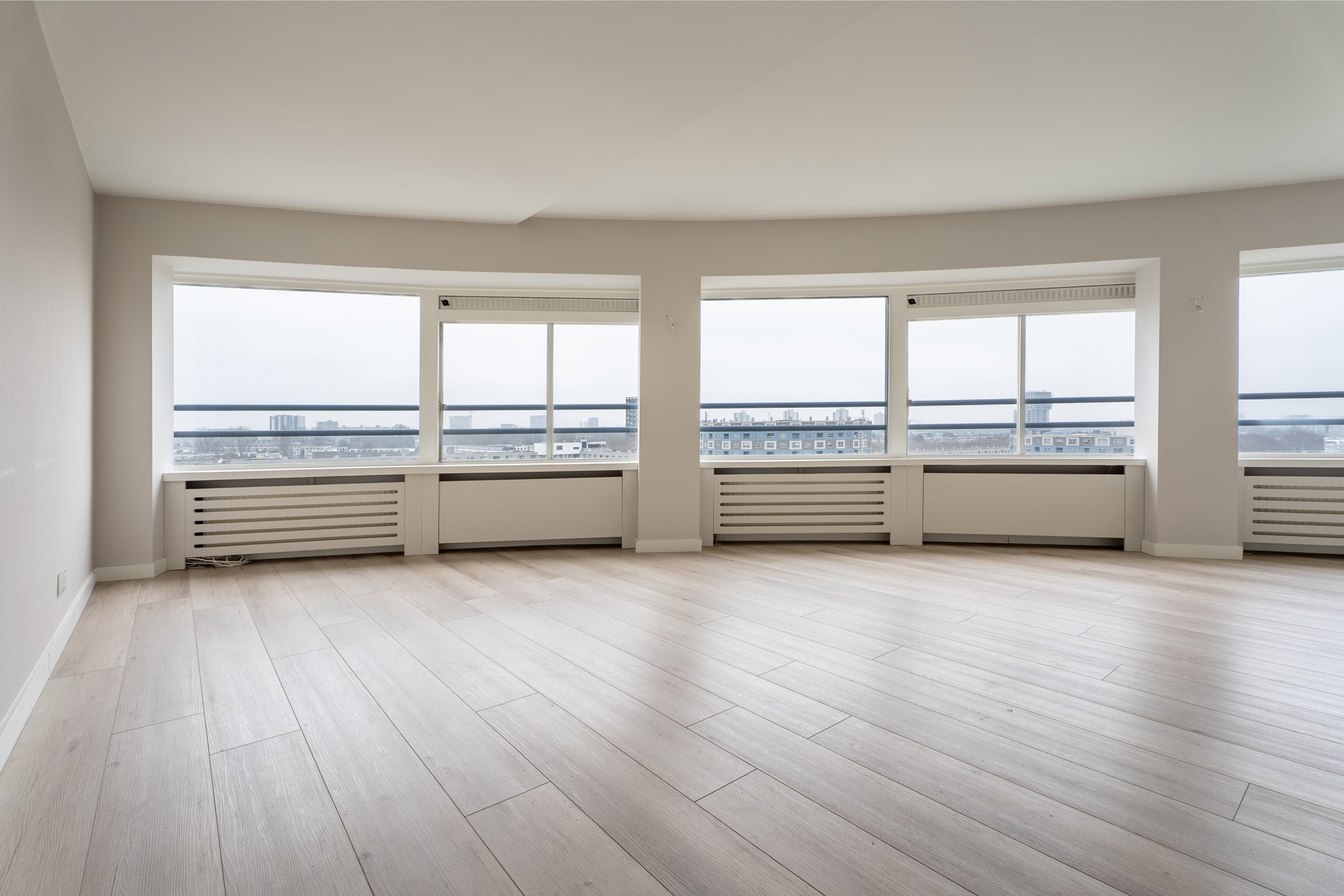 Aan het einde van de hal bereik je de zeer ruime woonkamer met speelse ronde indeling, waar de grote raampartijen zorgen voor een prettige lichtinval en een geweldig uitzicht.