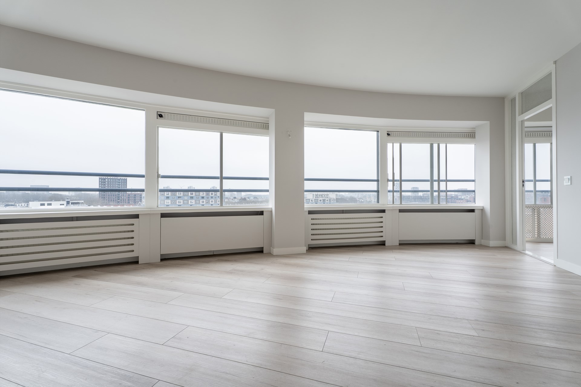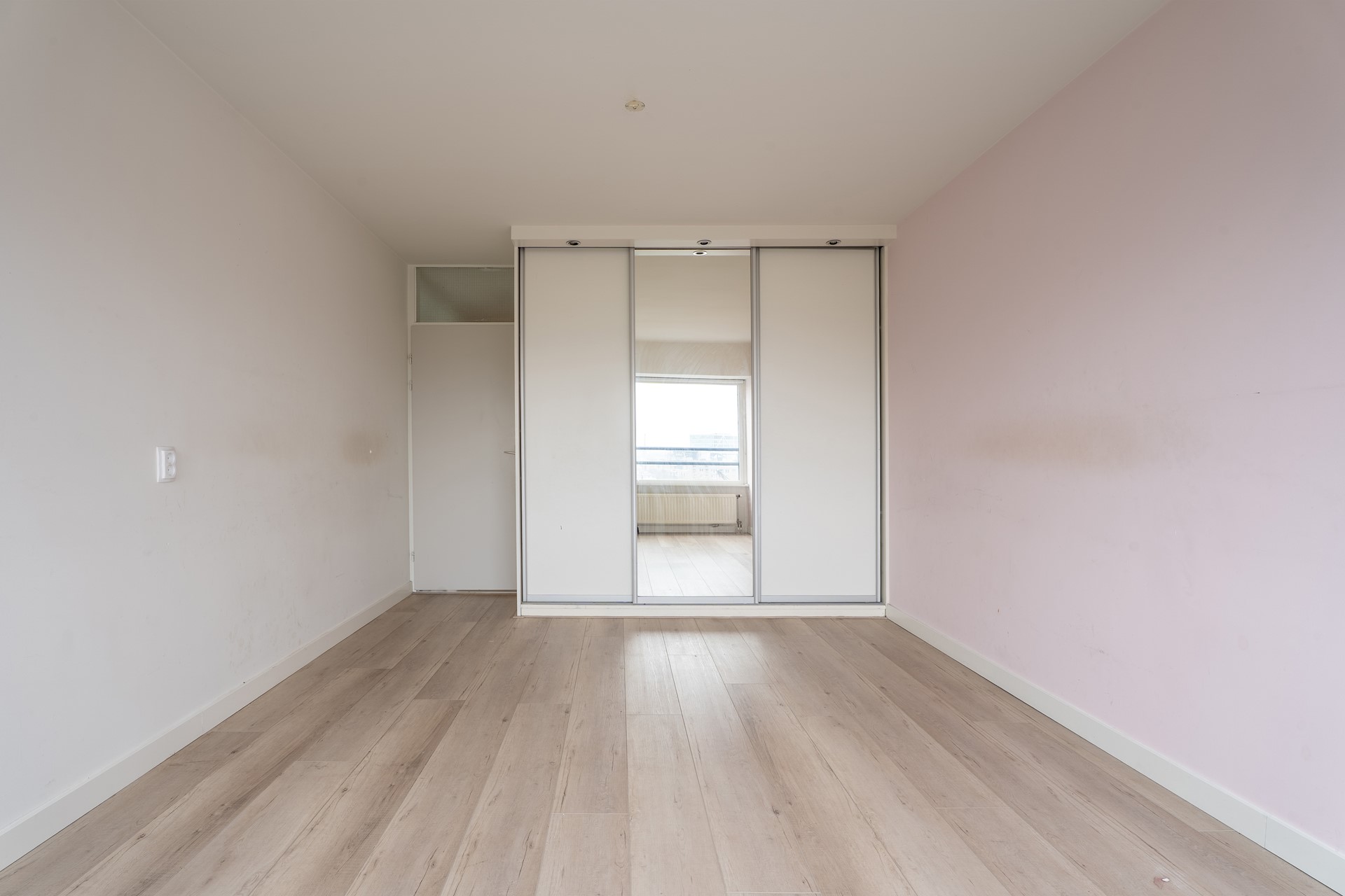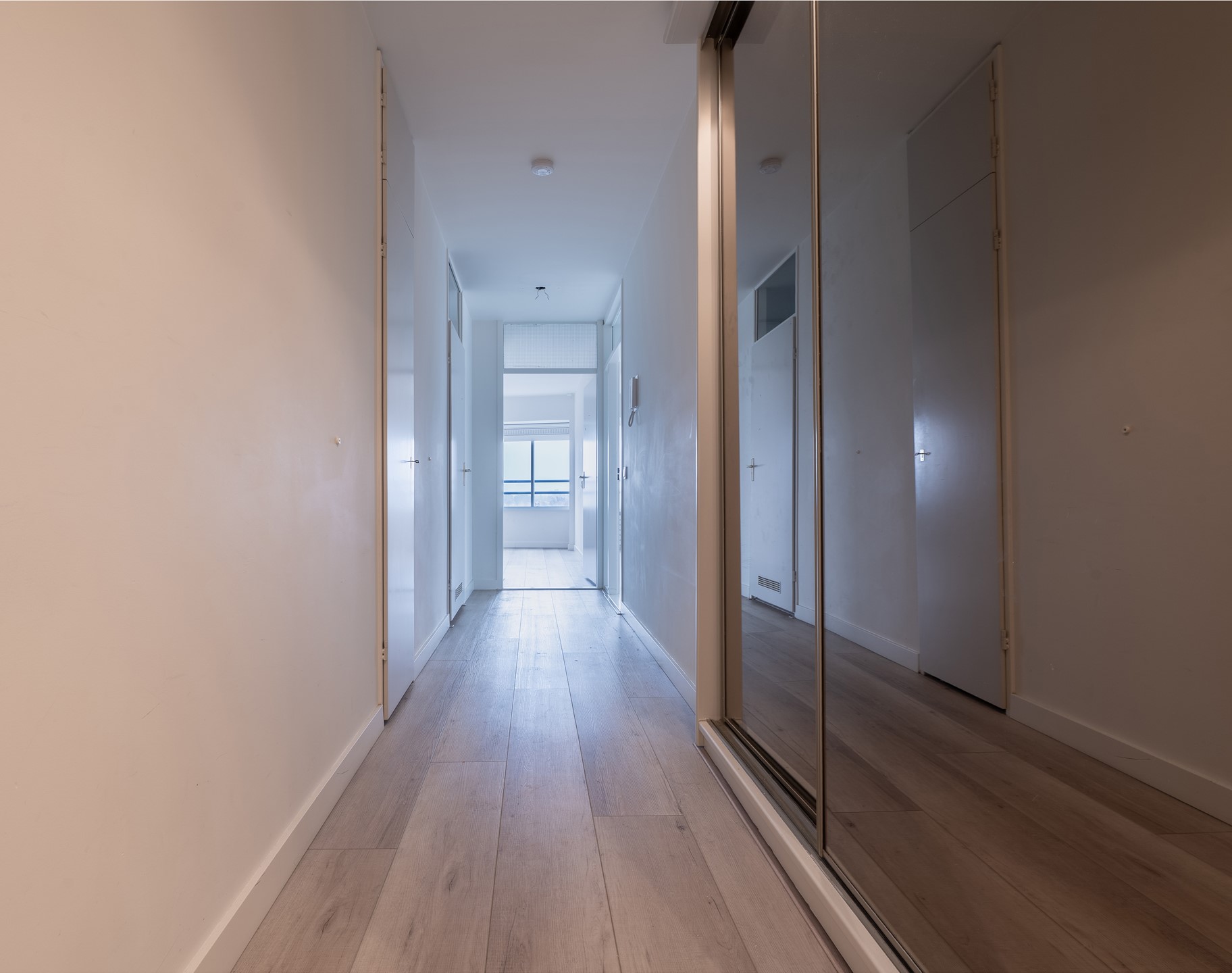 Het volledige appartement is voorzien van een laminaatvloer en een strak gestuukte wandafwerking.