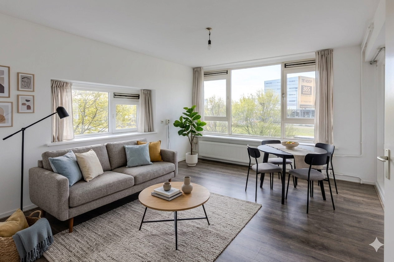 Aan de achterzijde van het appartement bevindt zich de ruime woonkamer. Dankzij de hoekligging profiteer je hier van een prettige lichtinval en een extra gevoel van ruimte. Tevens biedt de deur hier toegang tot het balkon.