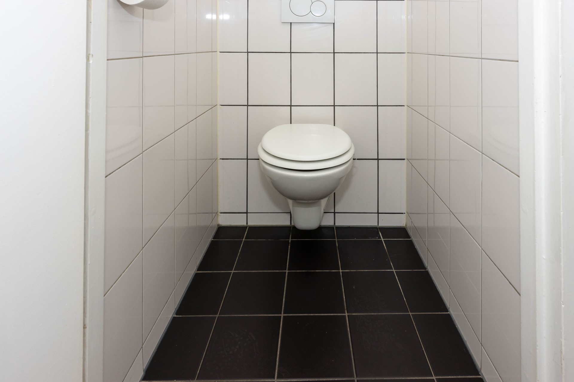 Direct naast de keuken bevindt zich het separate toilet, dat deels is betegeld en is voorzien van een modern hangend closet.