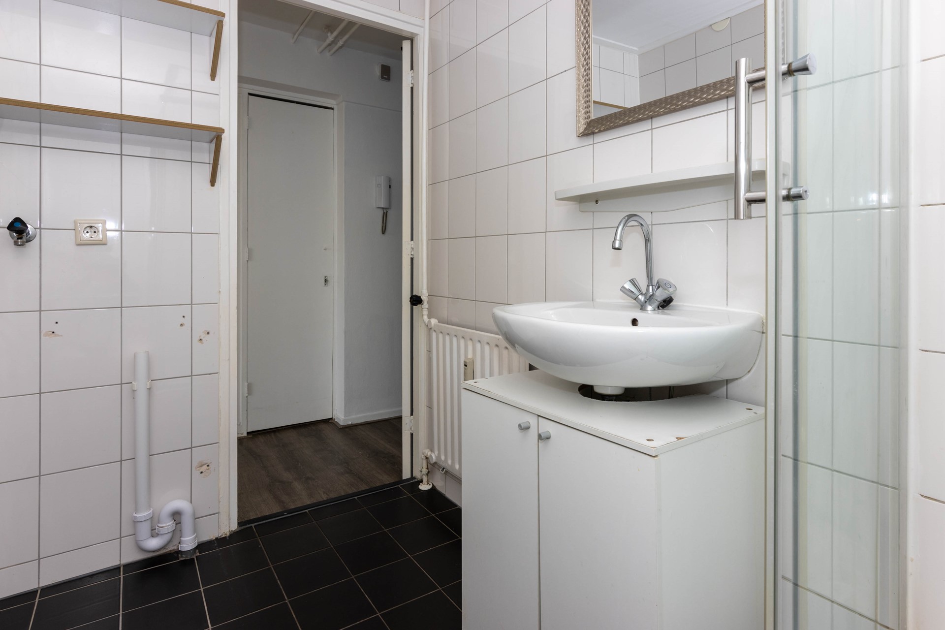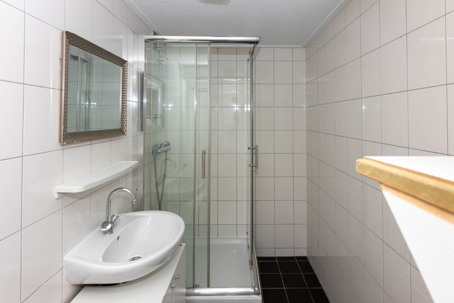 Verder in de hal, naast het toilet, bevindt zich de badkamer. Deze is volledig betegeld en voorzien van een douchecabine en een wastafel met meubel. Daarnaast is hier de aansluiting voor de wasmachine gerealiseerd.