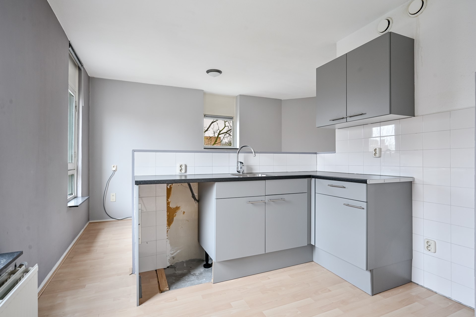 De keuken is zowel vanuit de hal als vanuit de woonkamer bereikbaar. De keuken is eenvoudig uitgevoerd en biedt de mogelijkheid tot het aansluiten van een vaatwasser, met voldoende ruimte om deze naar eigen wens te moderniseren.