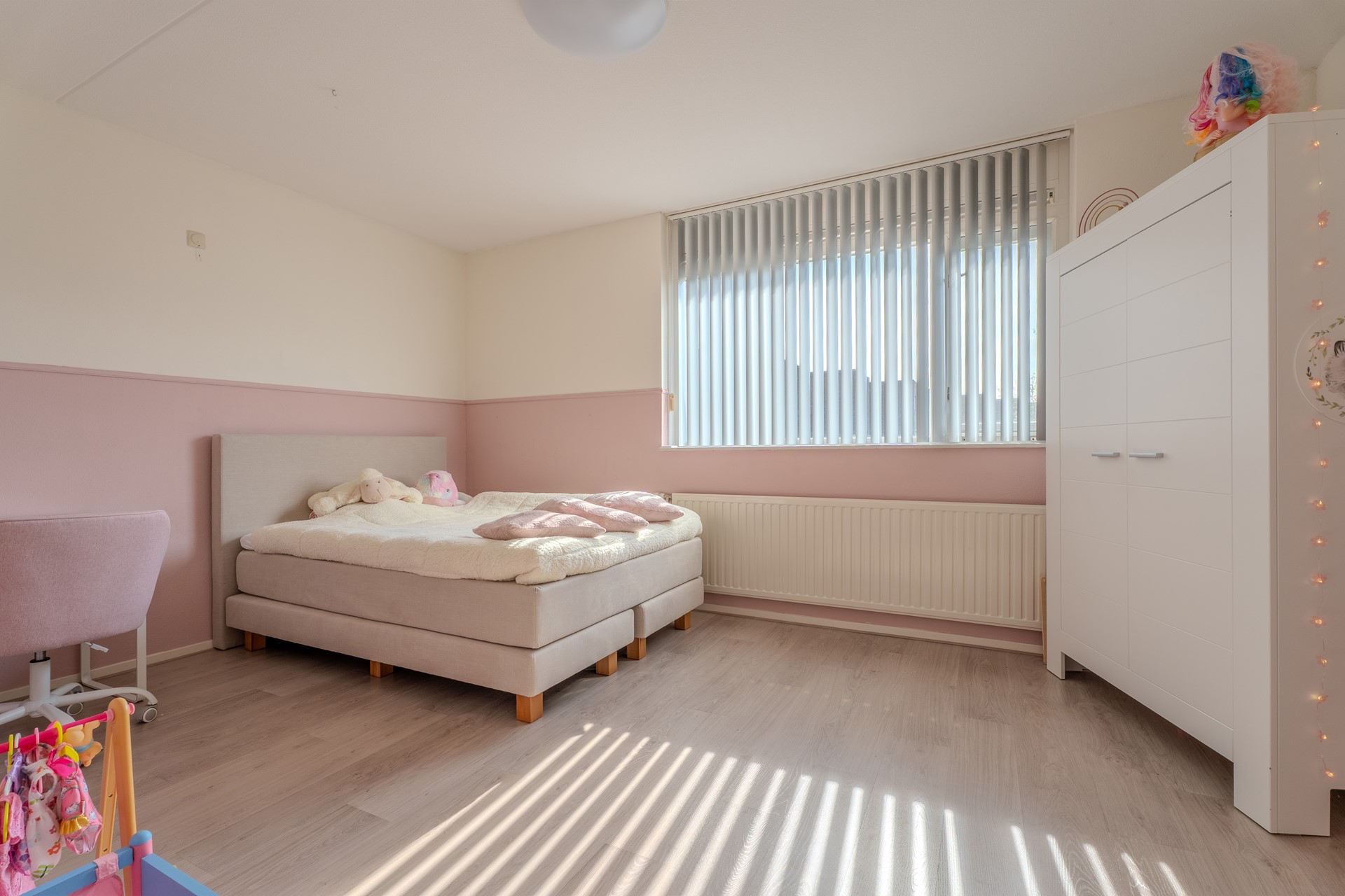De voormalige garage is volledig bij de woning betrokken en omgebouwd tot extra woonruimte. Door de vaste pui, verwarming en goede isolatie is hier een volwaardige kamer ontstaan die uitstekend kan dienen als bijvoorbeeld een werkruimte, speelkamer of slaapkamer. Ook deze ruimte is afgewerkt met een laminaatvloer en biedt toegang tot een extra bergkast onder de trap.