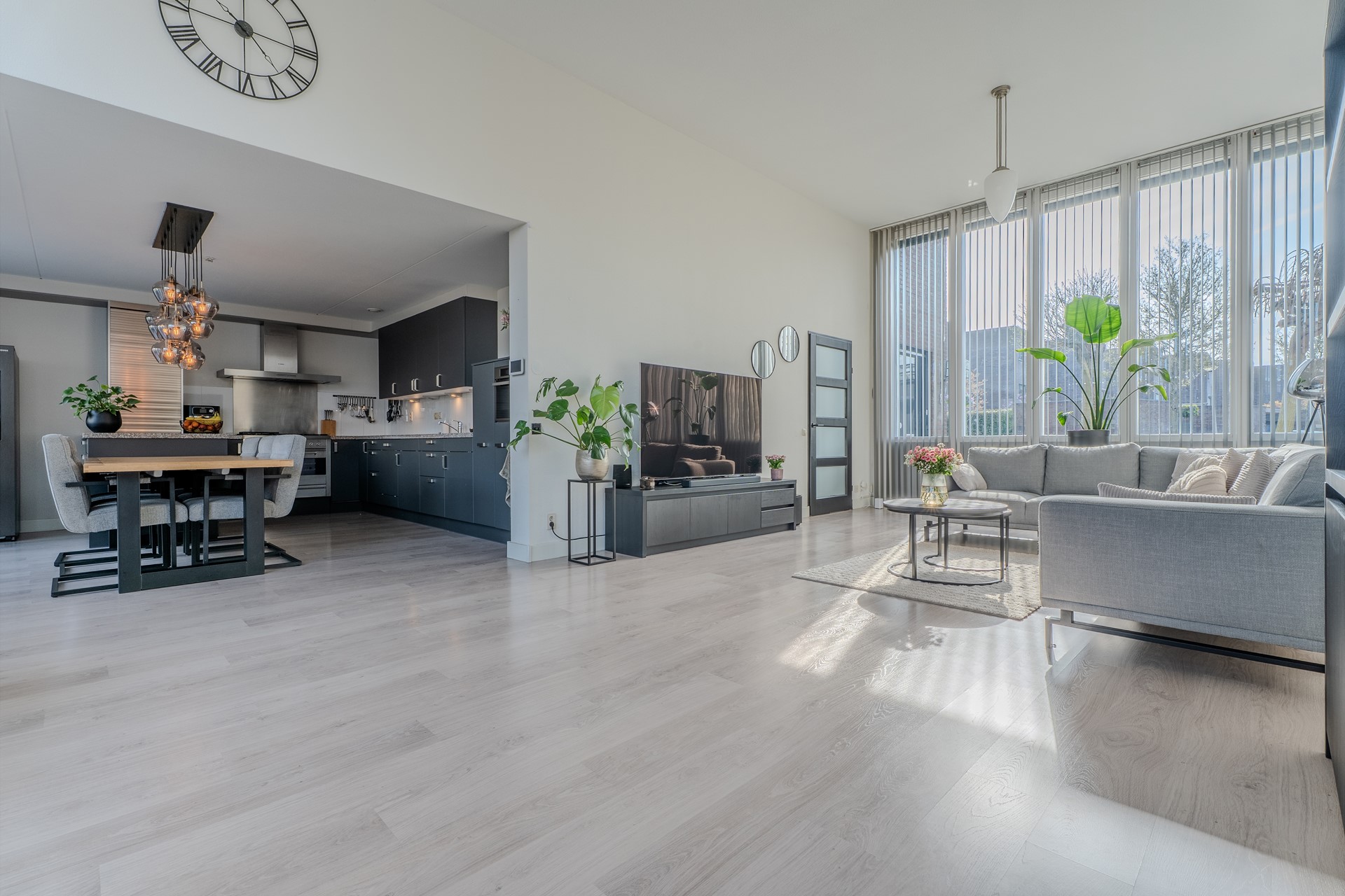 De woonkamer is opvallend ruim en zeer licht dankzij de grote raampartijen. Dit maakt het een heerlijke leefruimte waar je optimaal kunt genieten van het uitzicht op de tuin en de natuurlijke lichtinval. De ramen aan de voorzijde van de woonkamer zijn voorzien van elektrische screens.