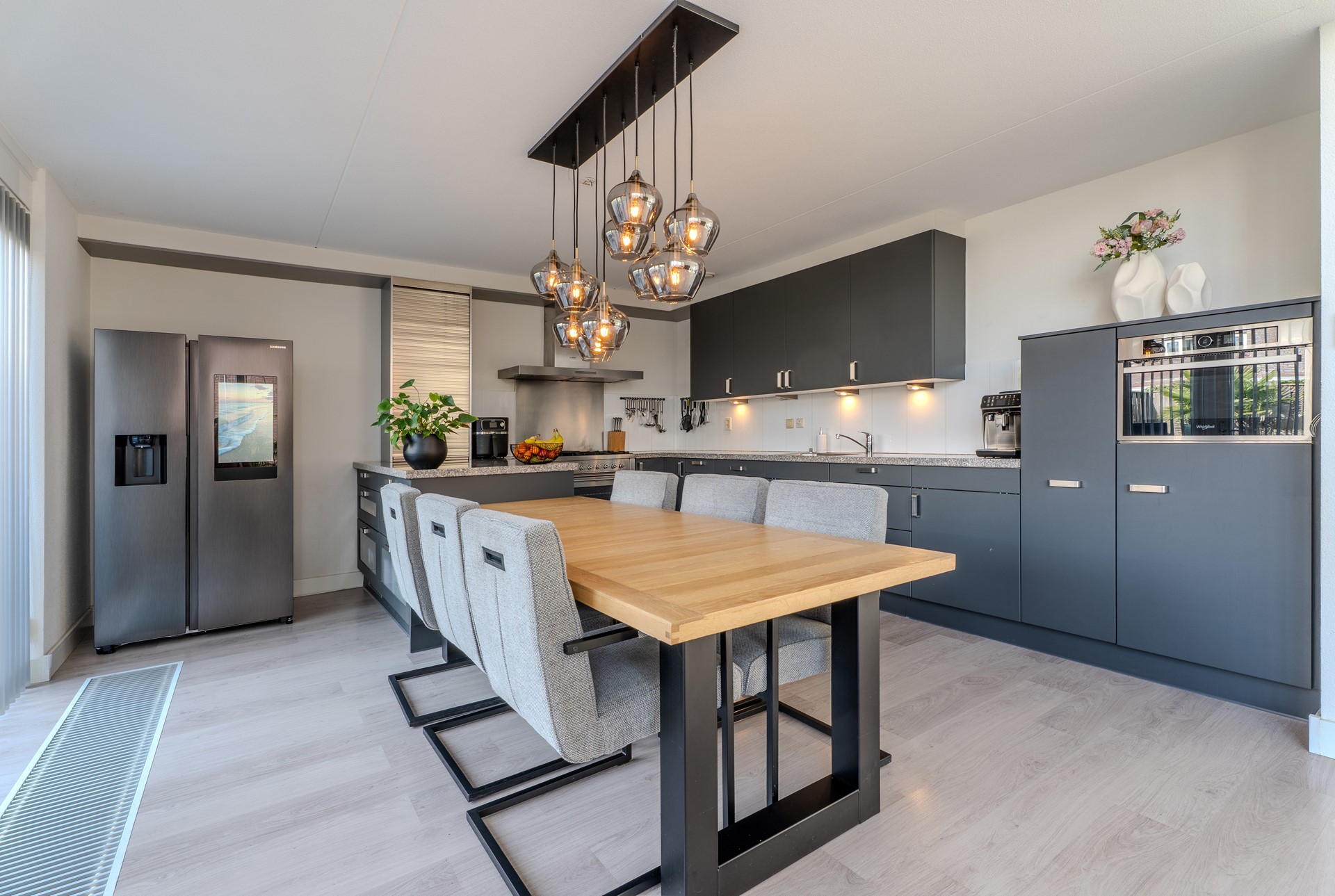 Via de woonkamer bereik je aan de achterzijde van de woning de zeer ruime leefkeuken. De keuken heeft in 2023 een nieuwe uitstraling gekregen doordat deze volledig is gewrapt. Daarnaast is de keuken voorzien van een losse Amerikaanse hightech koel-vriescombinatie, een combimagnetron, een Boretti 5-pits gasfornuis met oven en een vaatwasser.
