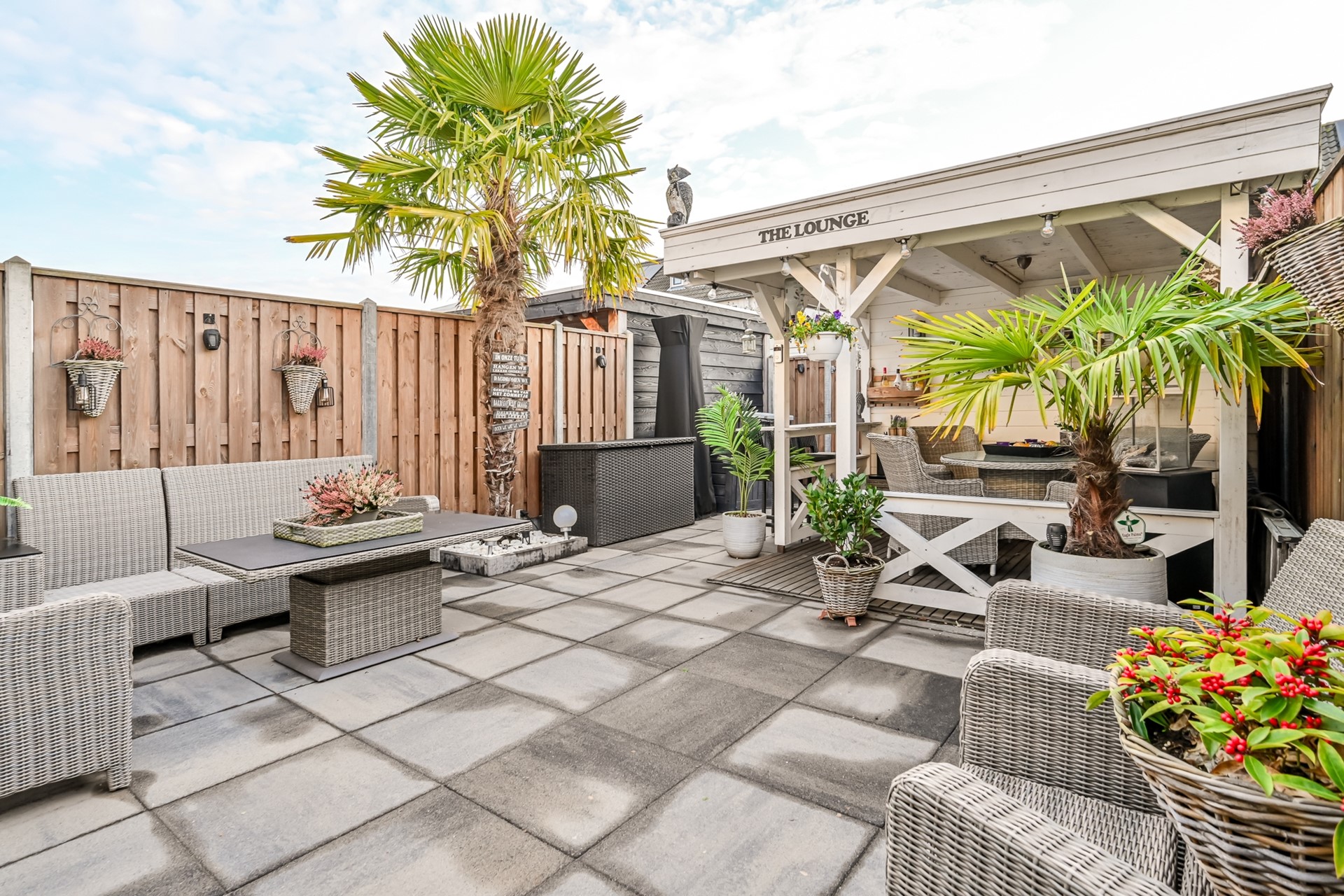 De achtertuin is sfeervol aangelegd en beschikt over een vrijstaande houten berging met overkapping, een elektrisch zonnescherm en een achterom.