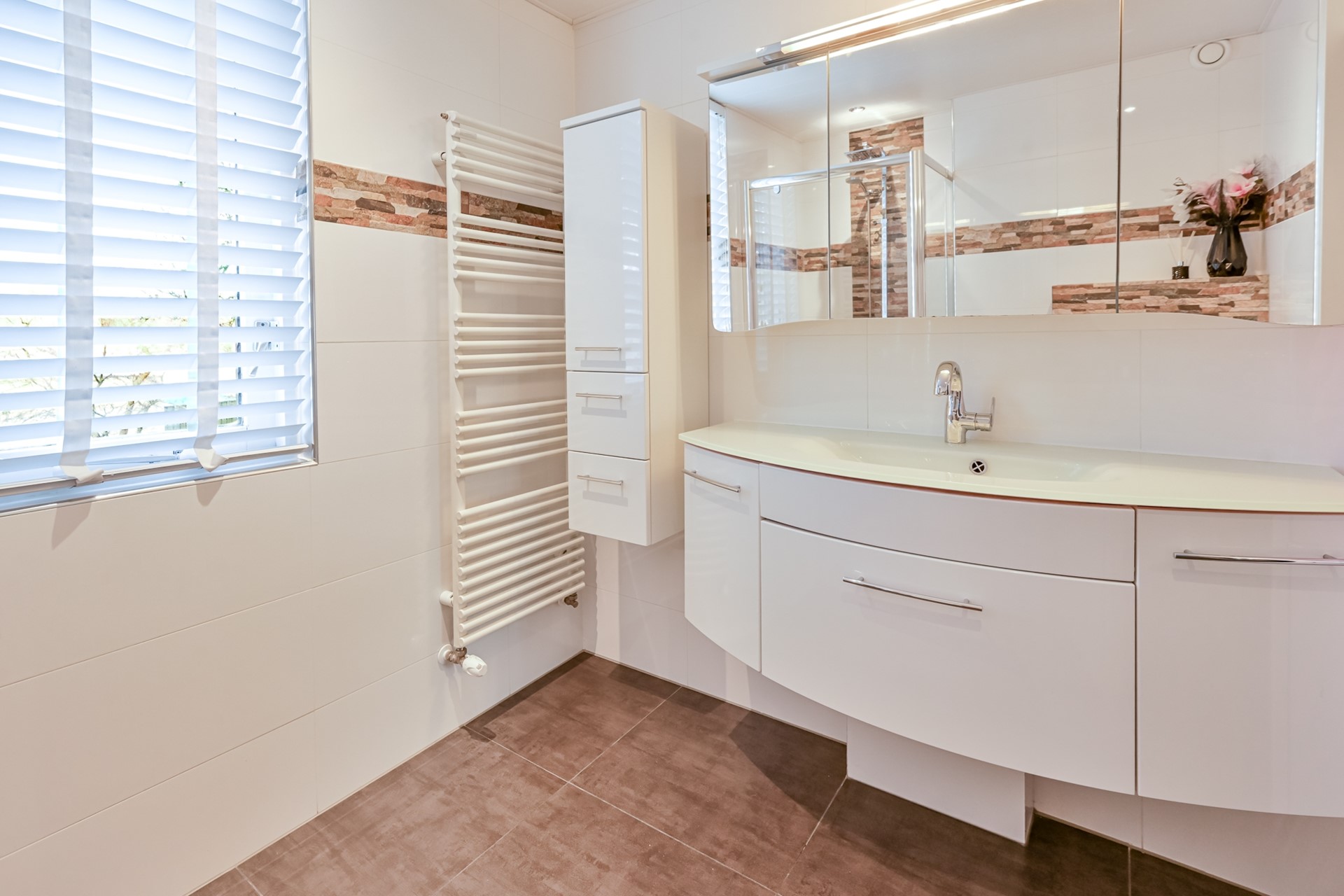 De volledig betegelde badkamer is uitgerust met een ruime inloopdouche, een hangend toilet en een wastafelmeubel.