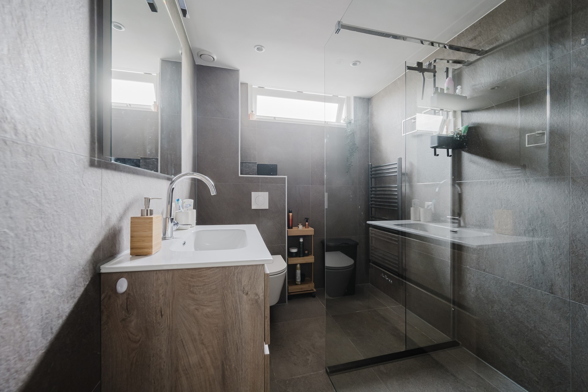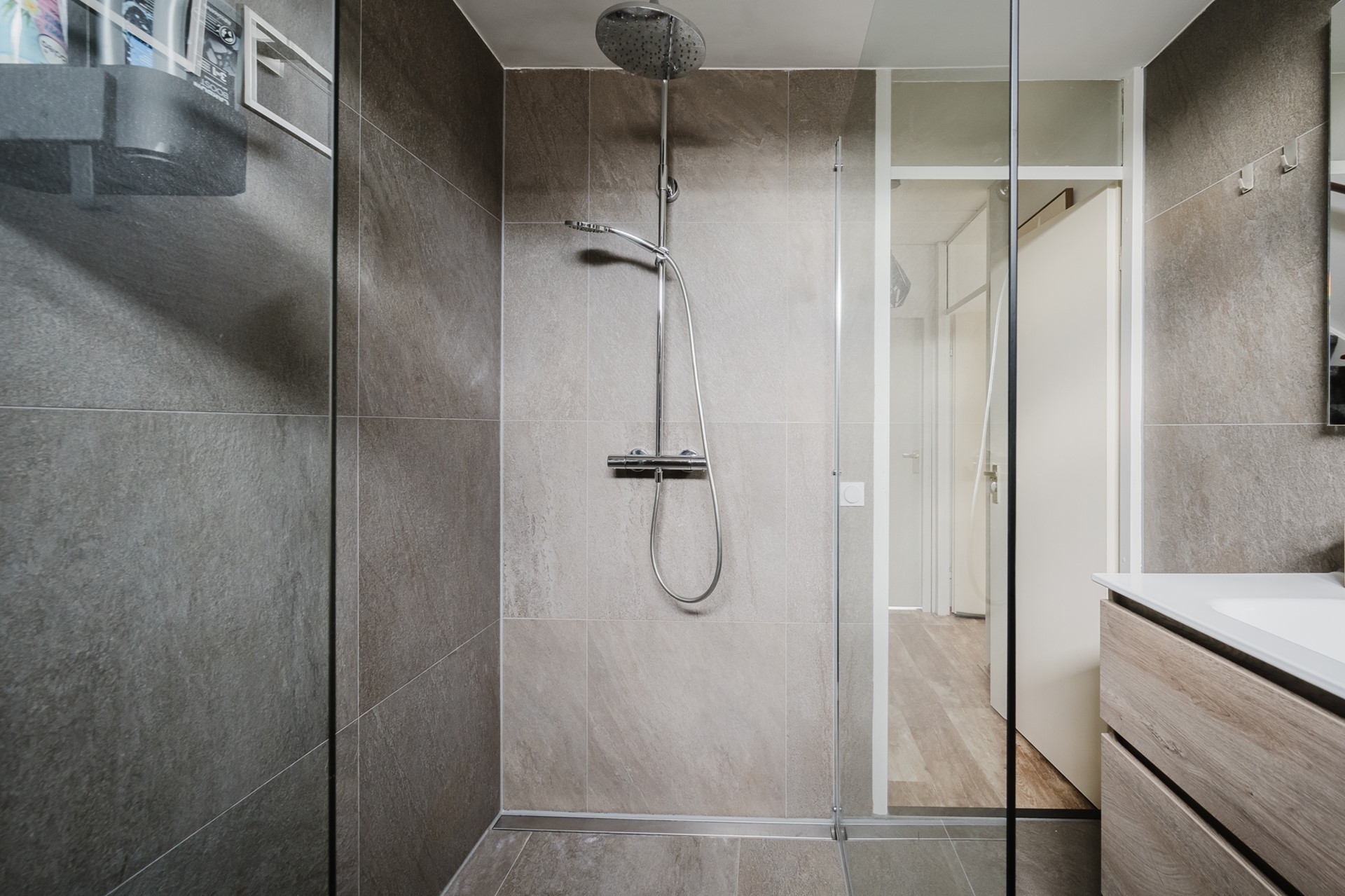De badkamer (2021) is modern en voorzien van een inloopdouche, wastafelmeubel, toilet en mechanische ventilatie (2023).