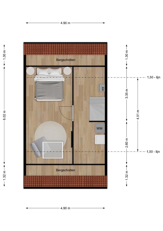 Via de trap bereik je de tweede verdieping met voorzolder en derde slaapkamer.