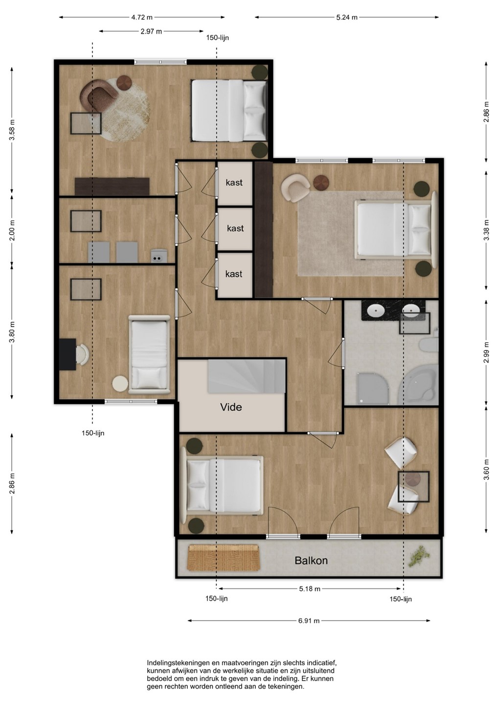Via de trapopgang bereik je de eerste verdieping, waar je direct uitkomt op de vide die een mooi uitzicht biedt op de hal beneden. De eerste verdieping is ingedeeld met maar liefst vier slaapkamers, de badkamer, drie praktische bergingen én een aparte wasruimte.