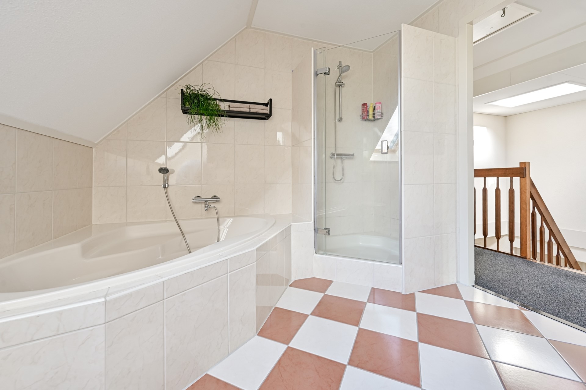 De royale badkamer is volledig betegeld en uitgerust met een ruim hoekbad, een douche, een hangend toilet en een dubbele wastafel met meubel.