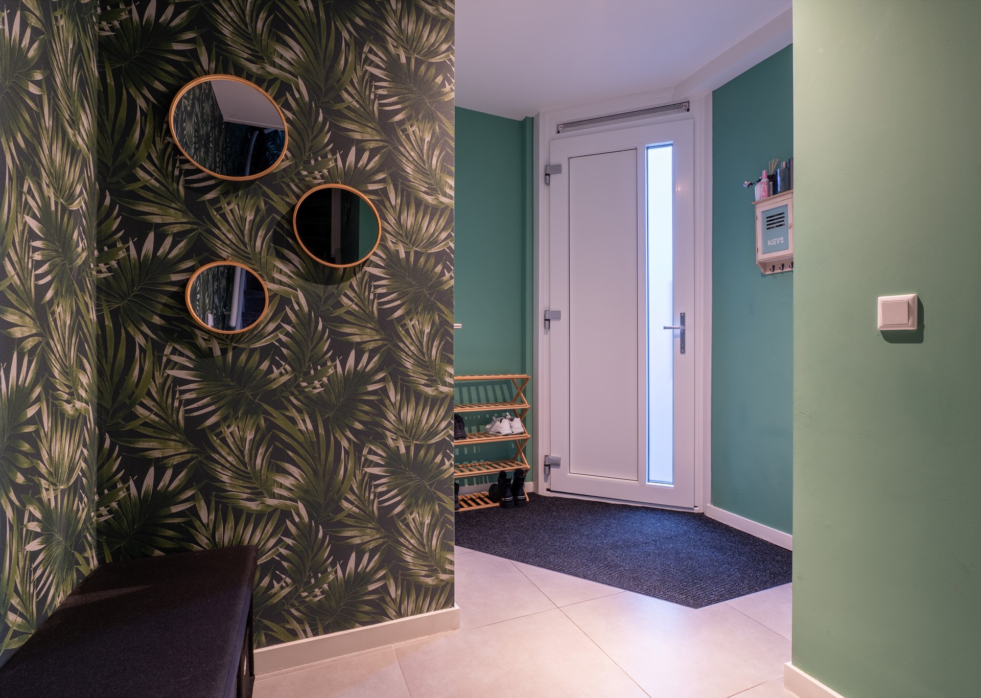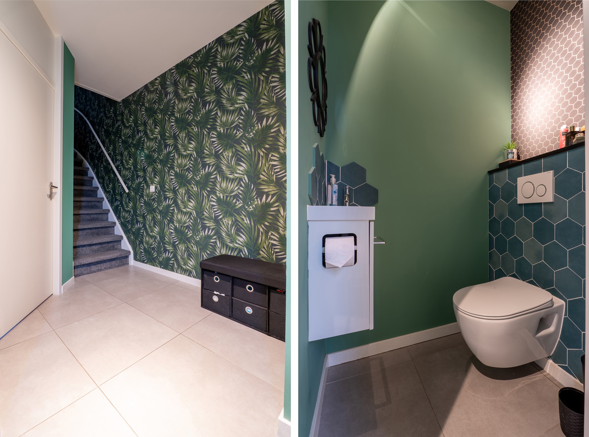Via de eigen oprit en voortuin bereik je de entree van de woning. In de hal bevinden zich het moderne toilet (2023), de trapopgang en de toegang tot de woonkamer en keuken.