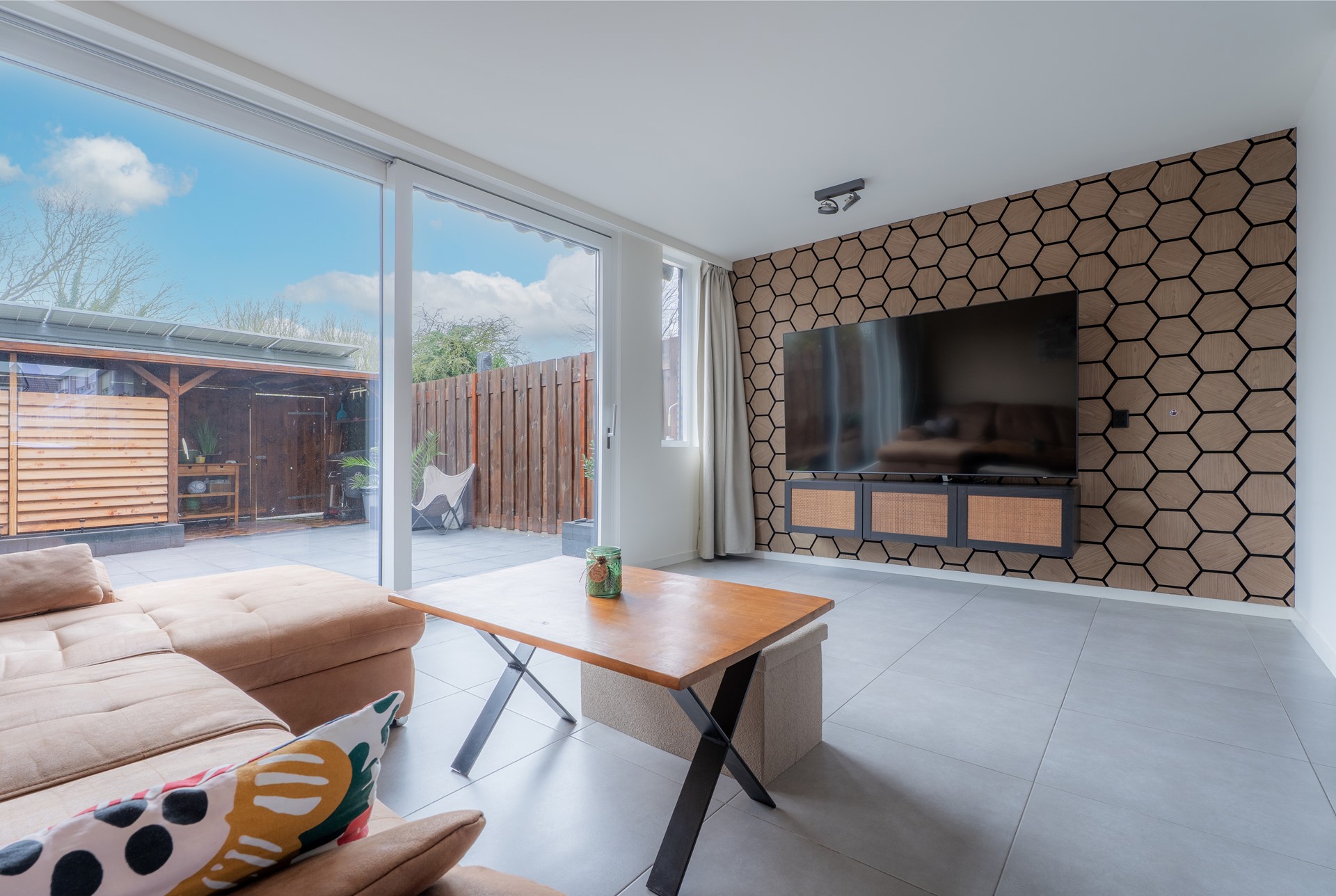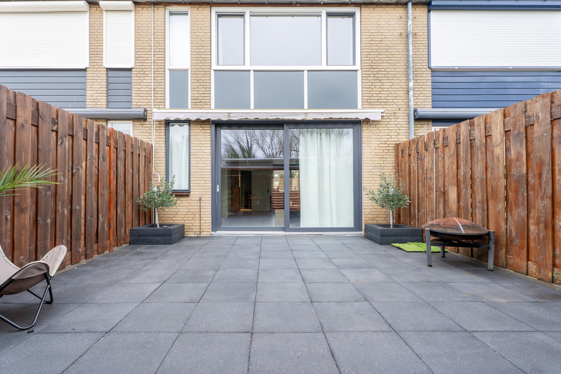 De achtertuin is gelegen op het zuidwesten, is in 2021 aangelegd, onderhoudsvriendelijk betegeld en voorzien van een overkapping en een achterom. Hier geniet je in alle rust van het vrije, groene uitzicht.