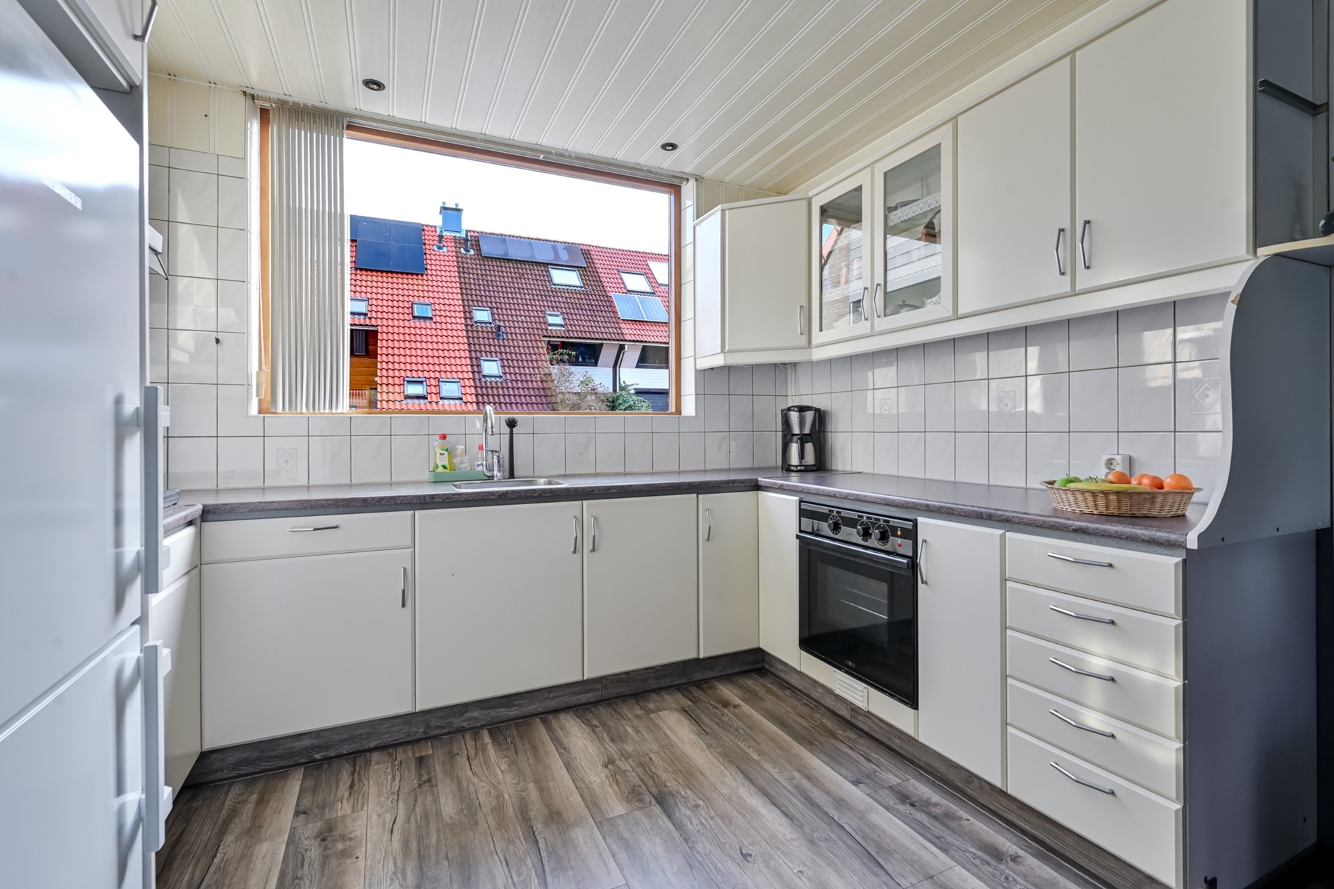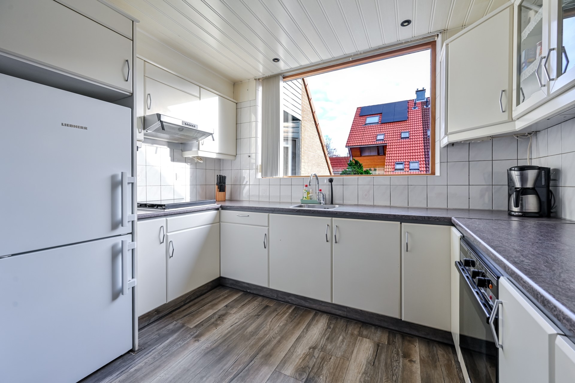 De keuken is uitgerust met een close-in-boiler, een losse koel-vriescombinatie, een oven, afzuiging en een 4-pits gaskookplaat.