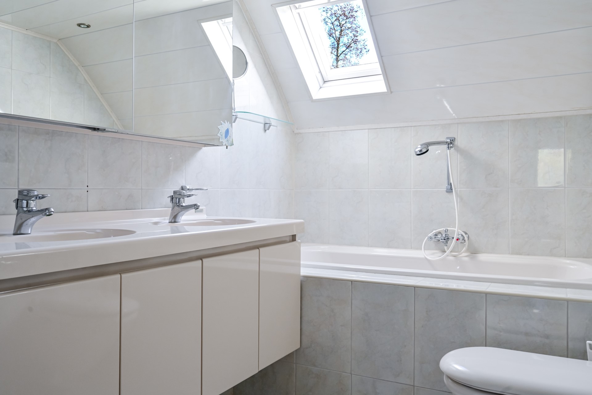 De zeer ruime badkamer is compleet uitgevoerd en voorzien van een ligbad, een aparte douchecabine, een dubbele wastafel met meubel en een hangend toilet.