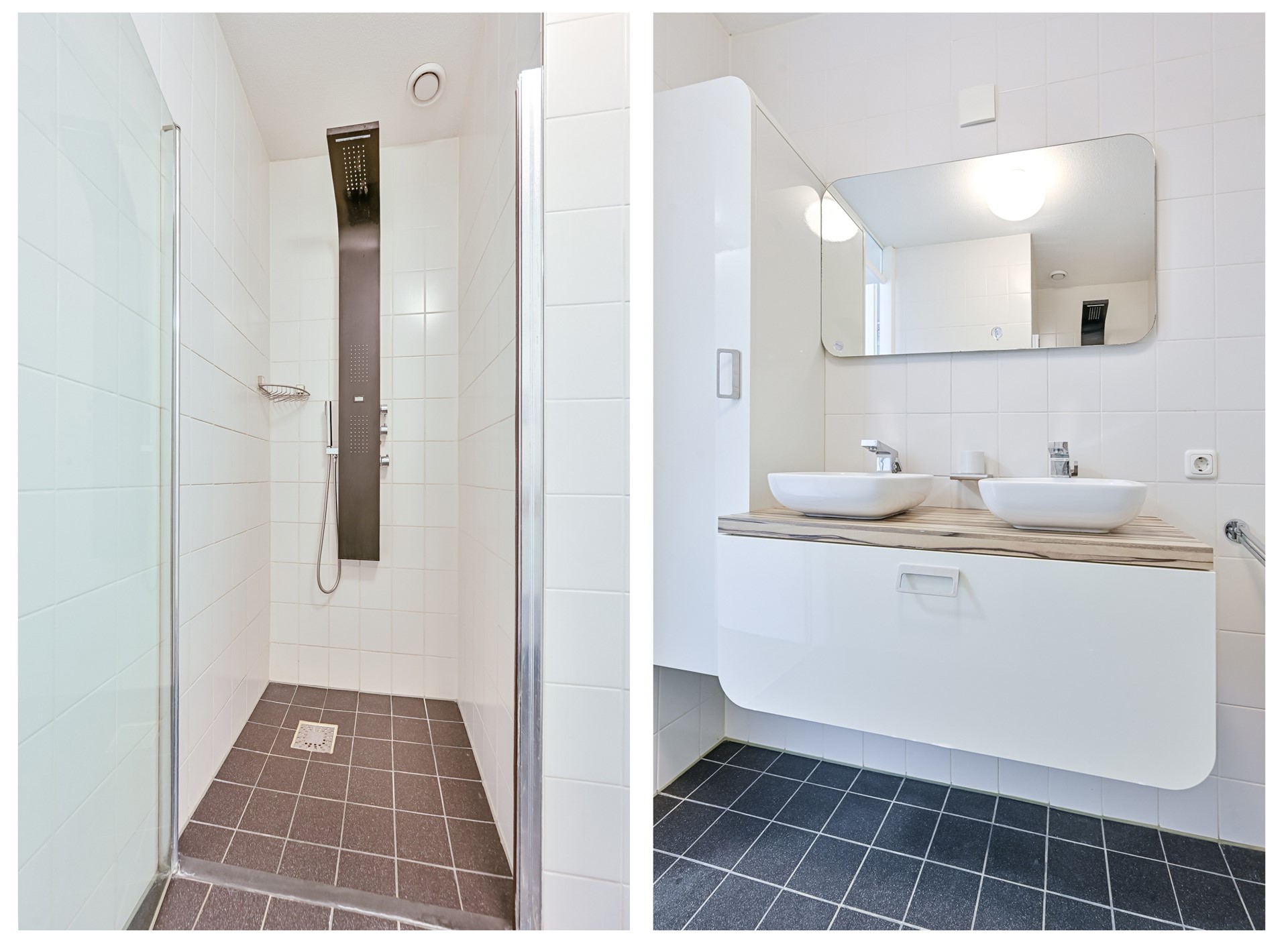 De badkamer is verzorgd en compleet uitgevoerd met een ruime inloopdouche, een wastafelmeubel met dubbele waskommen en een designradiator.