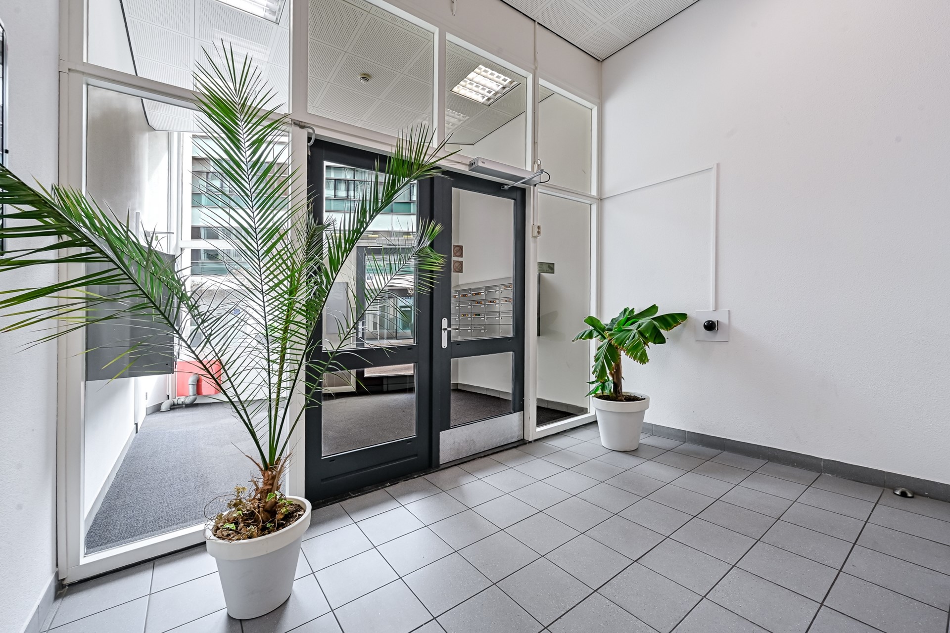 Via de trapopgang of de liftinstallatie bereik je de derde verdieping, waar het appartement is gelegen. De galerij aan de ‘binnenzijde’ van het complex biedt zicht op de verzorgde binnentuin.