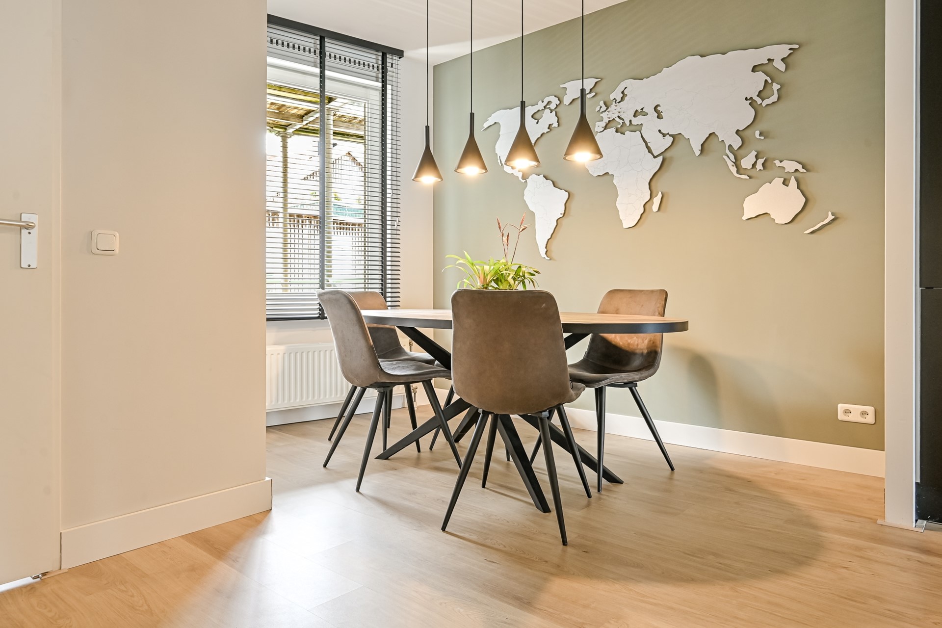 De woning kenmerkt zich door een speelse en praktische indeling. Je komt binnen via de entree met toegang tot de hal en de meterkast. Vanuit de hal bereik je de ruime eetkamer met aangrenzend de keuken in een lengteopstelling.