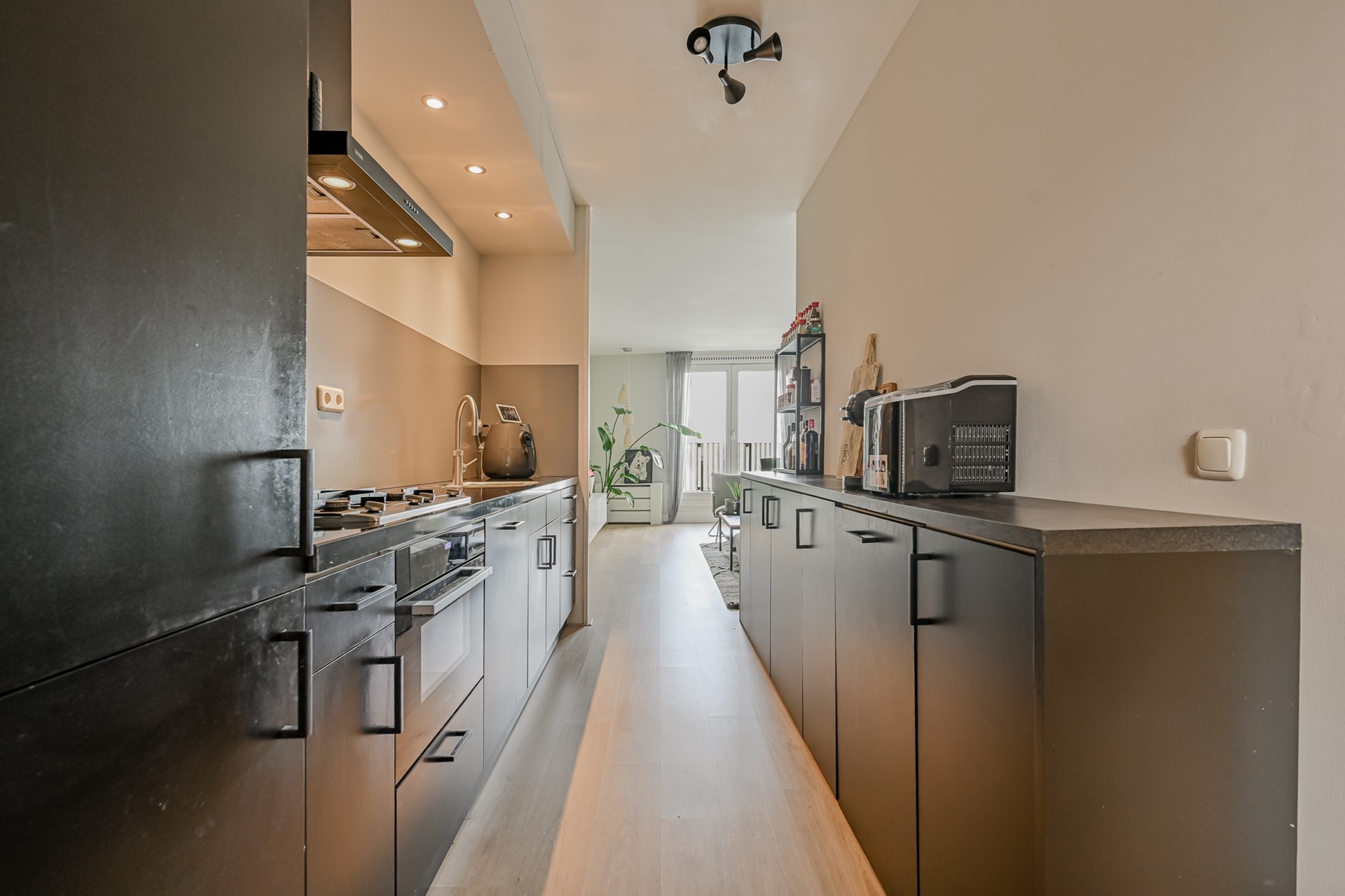 De keuken, uitgevoerd in een praktische lengteopstelling, beschikt over volop opbergruimte en is compleet uitgerust met een vaatwasser, combi-oven, 4-pits gaskookplaat, koel-vriescombinatie en een Quooker kokendwaterkraan.