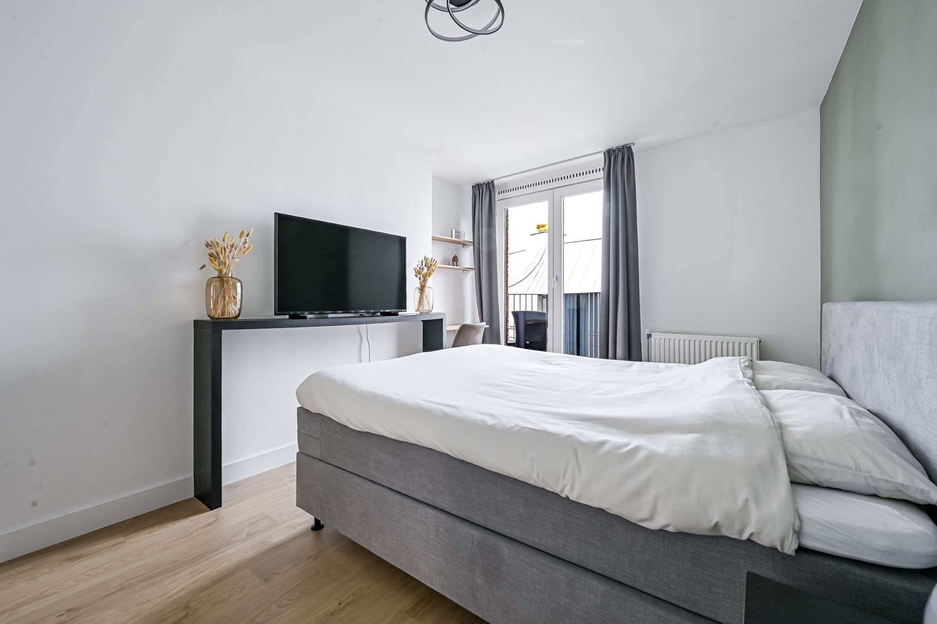 De slaapkamer aan de achterzijde van het appartement biedt bovendien via openslaande deuren directe toegang tot het balkon.