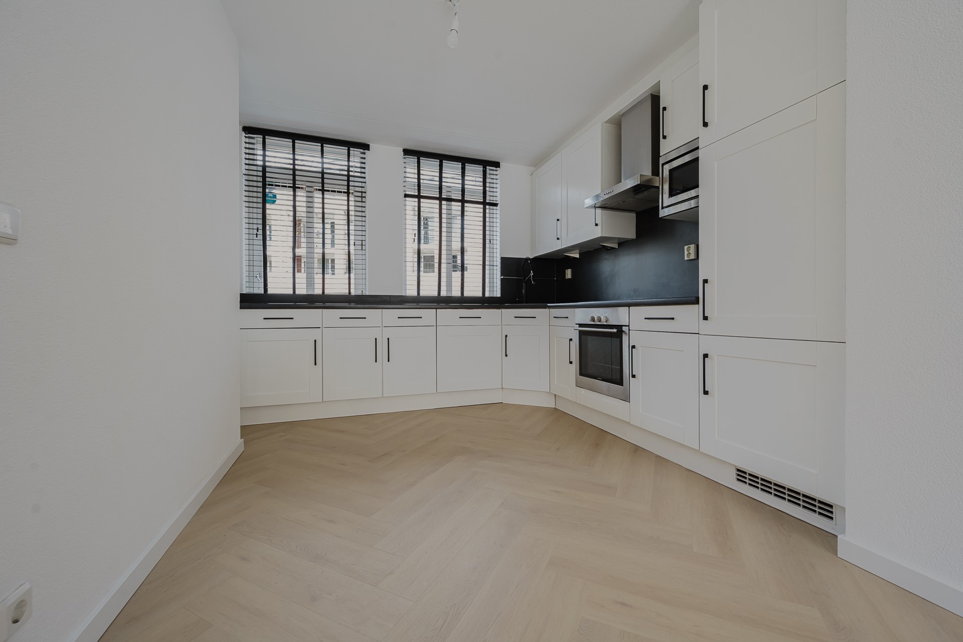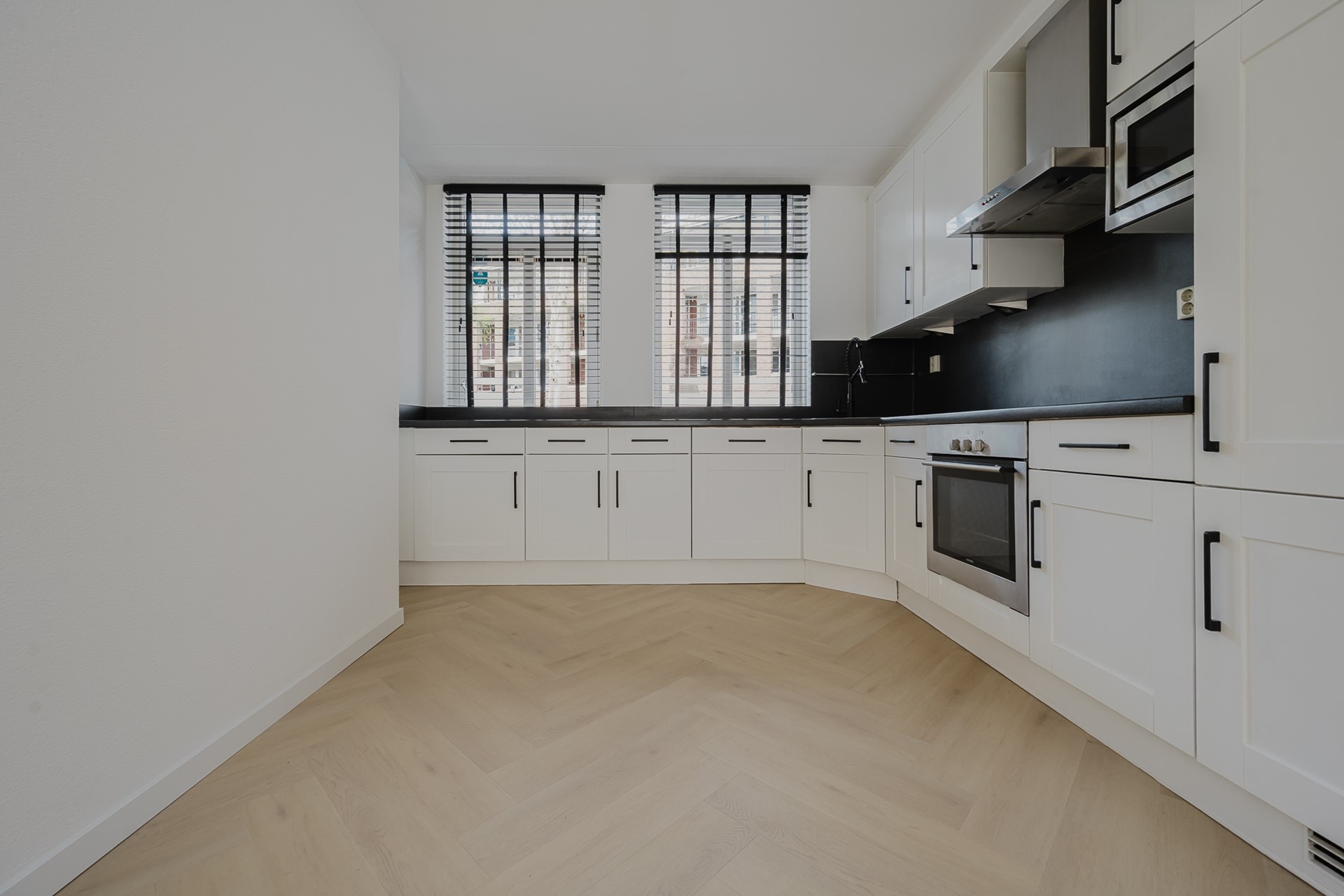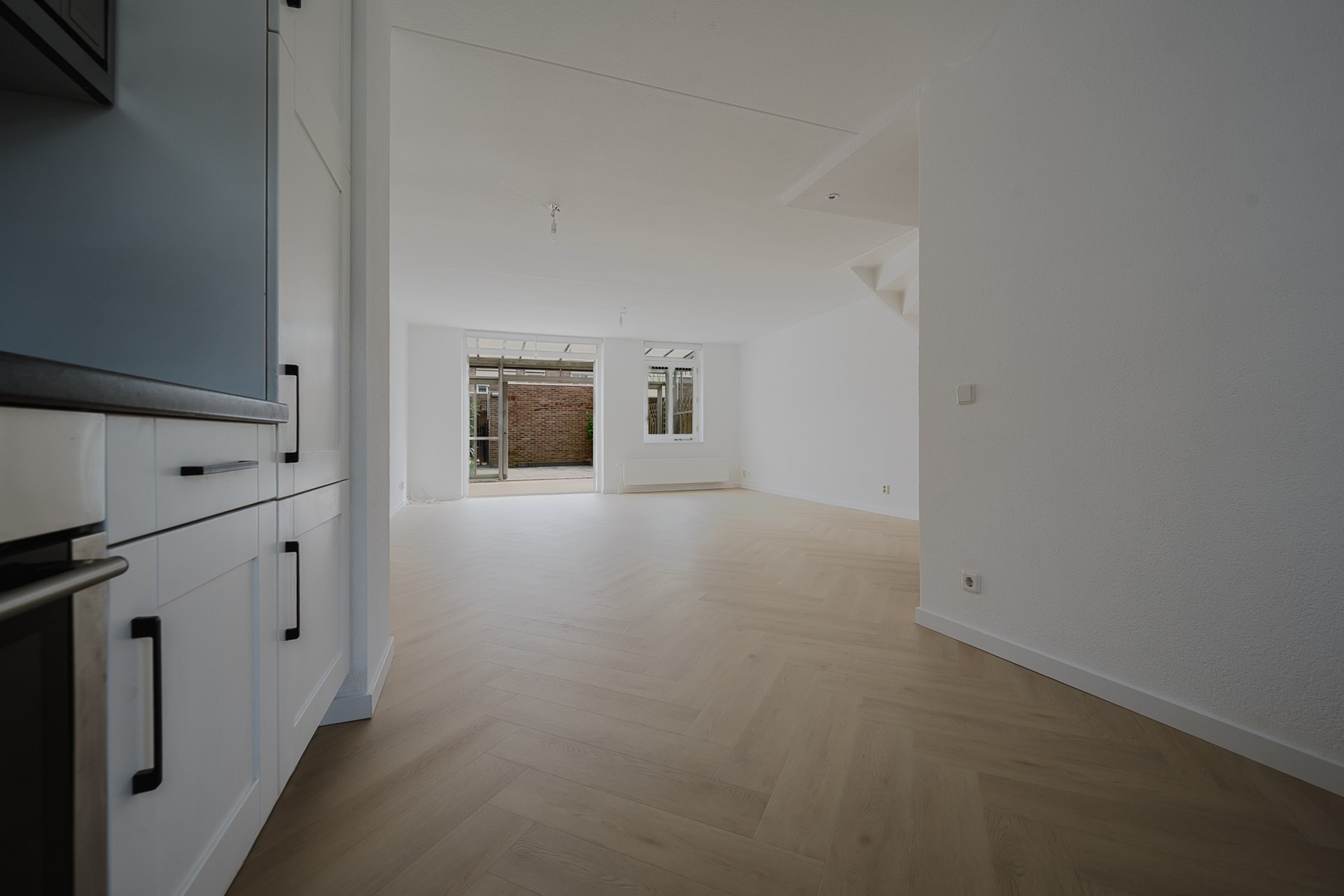 Vanuit de hal stap je de ruime woonkamer binnen. De woonkamer is strak afgewerkt met een visgraat PVC-vloer en gestucte wanden. Aan de voorzijde bevindt zich de open keuken, voorzien van inbouwapparatuur en voldoende kastruimte.