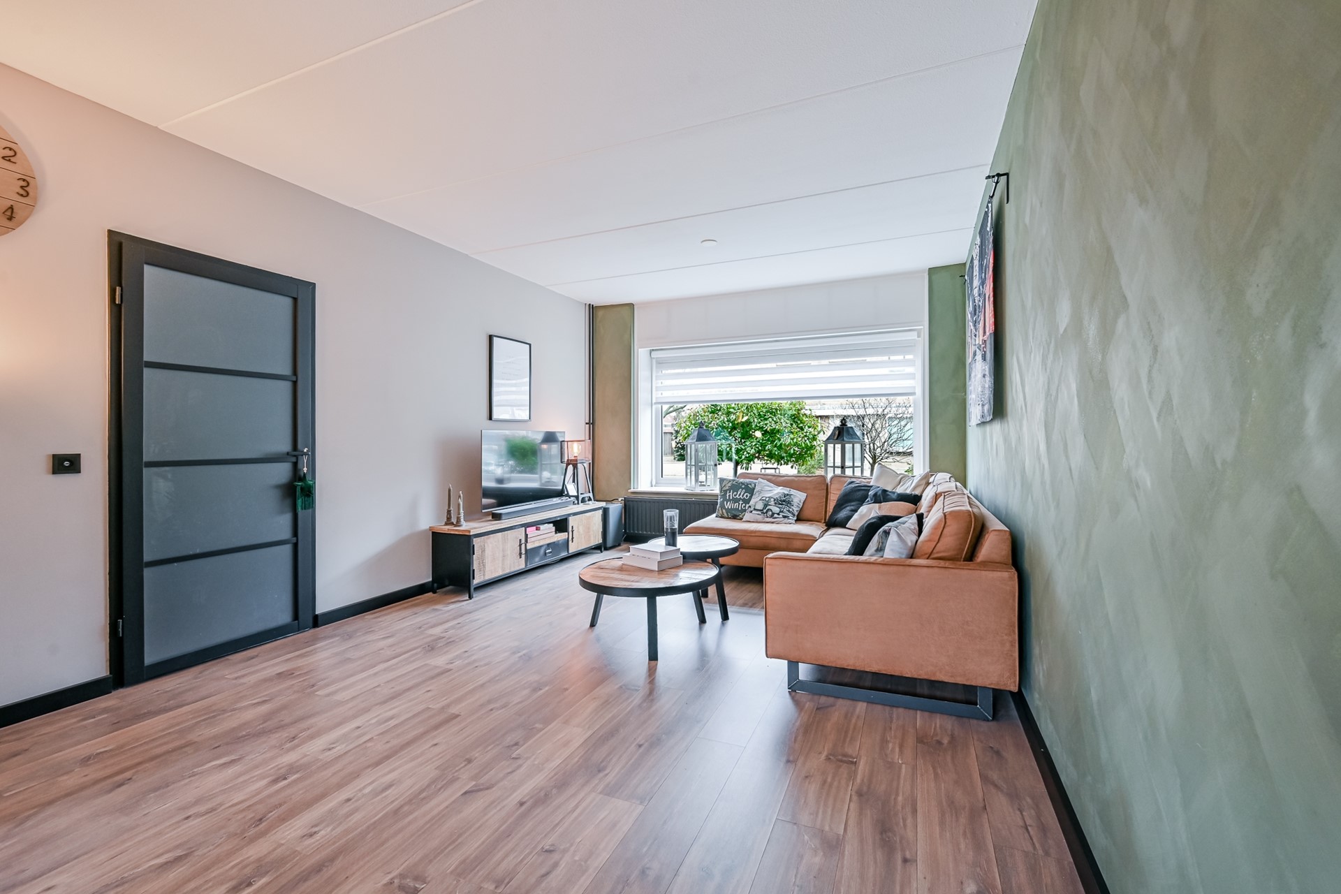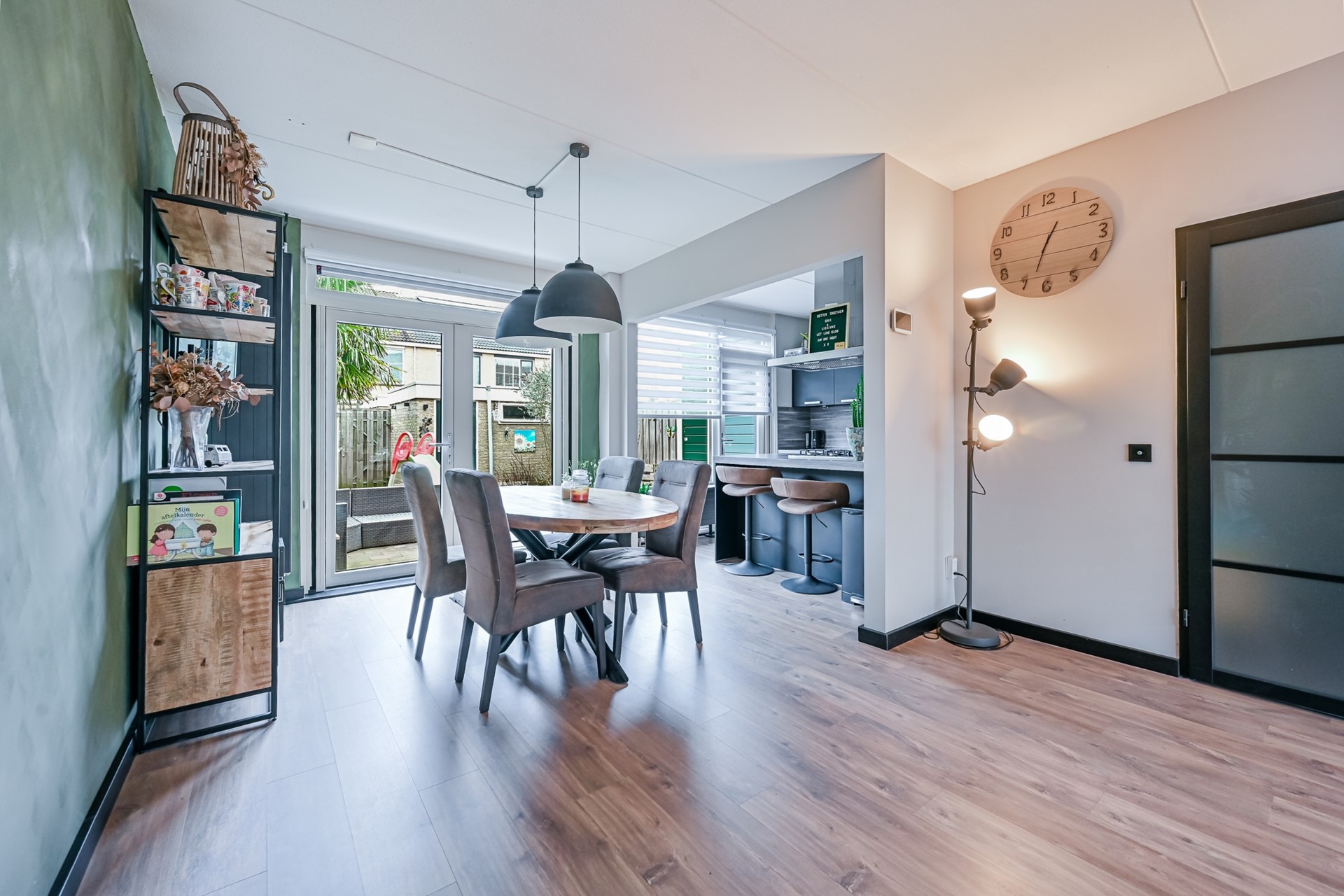 Via de hal bereik je de ruime woonkamer. De volledige begane grond is afgewerkt met een laminaatvloer en voorzien van vloerverwarming als bijverwarming.