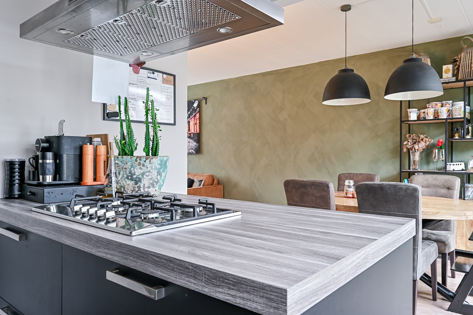 Aan de achterzijde van de woning bevindt zich de keuken met een sfeervol kookeiland, wat zorgt voor een prettige verbinding tussen koken en wonen. De keuken is in 2023 gewrapt en heeft daardoor een moderne uitstraling. Daarnaast is de keuken uitgerust met een 5-pits gaskookplaat, een oven, een magnetron, een vaatwasser en een koel-vriescombinatie.
