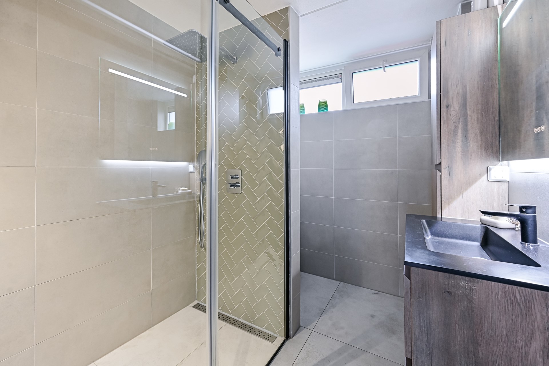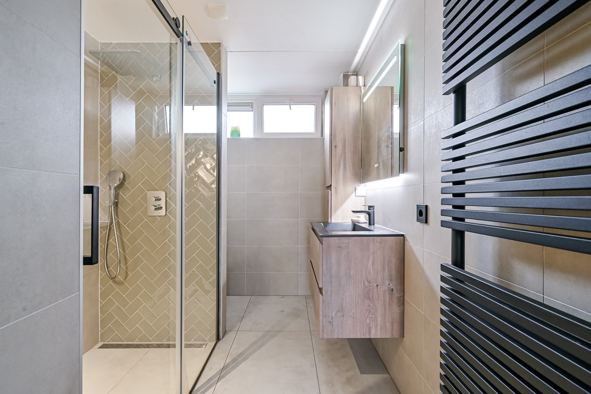 De badkamer is in 2021 volledig vernieuwd en uitgevoerd in een moderne, tijdloze stijl. De badkamer is volledig betegeld en voorzien van een ruime inloopdouche, een hangend toilet, een wastafel met meubel en een elektrische designradiator.