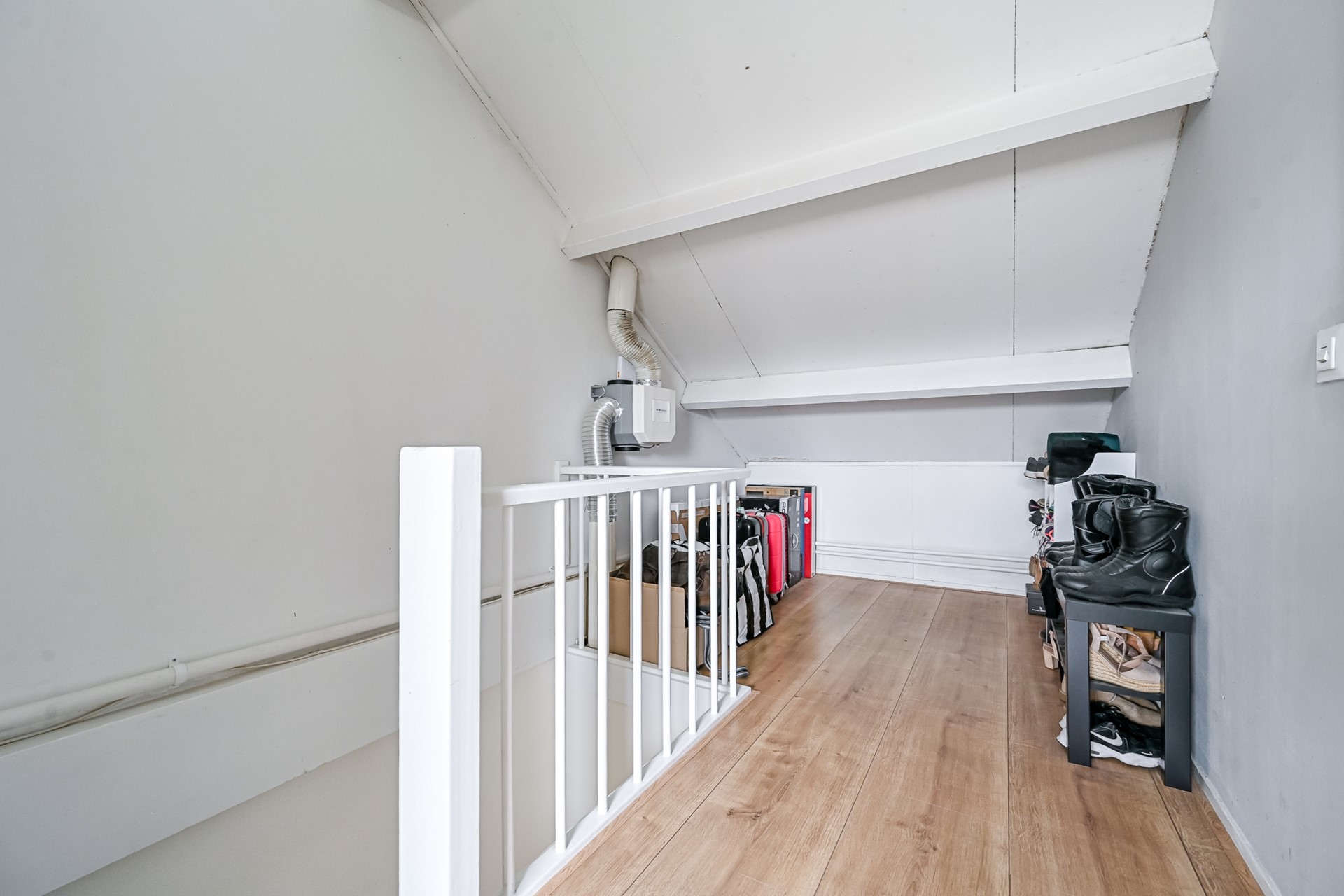 Via de trapopgang bereik je de tweede verdieping, welke is ingedeeld met een voorzolder en een zolderkamer. Op de voorzolder bevinden zich de aansluitingen voor de wasmachine en droger, de cv-installatie en de mechanische ventilatie. Daarnaast zorgt de vaste kast voor voldoende opbergruimte.