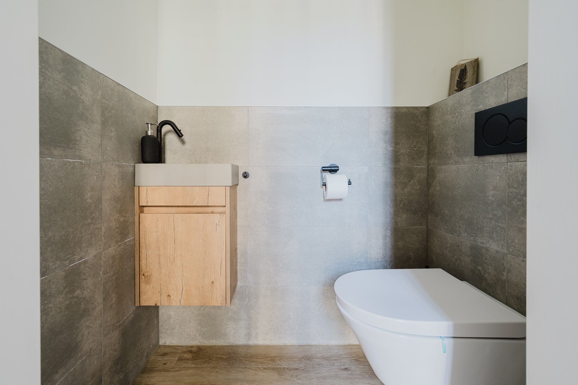 De badkamer is praktisch ingericht en voorzien van een douche, toilet, wastafel en wastafelmeubel.