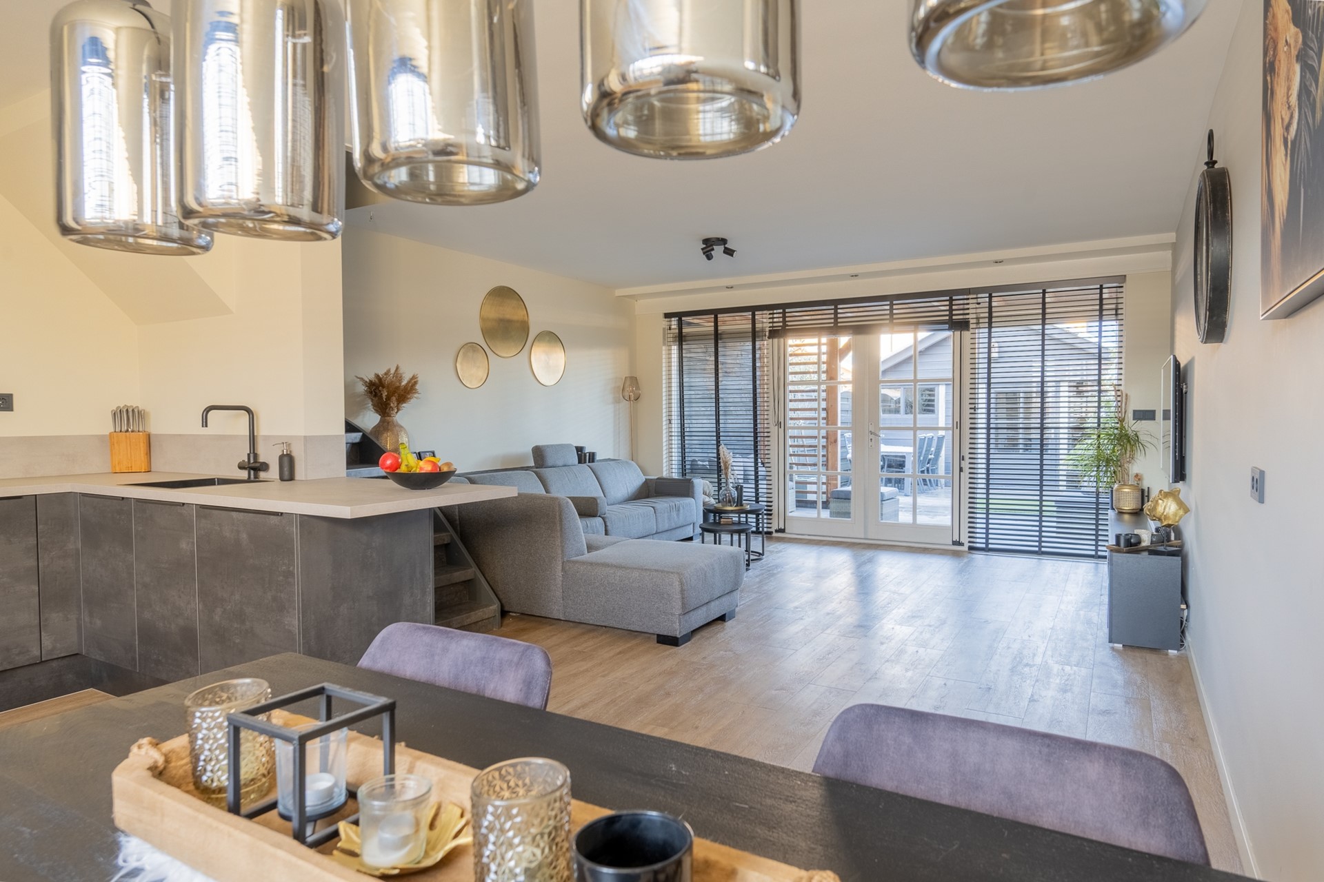 Vanuit de hal stap je de ruime en moderne keuken binnen (2021), voorzien van diverse inbouwapparatuur, waaronder een Quooker, combi-oven en voldoende kastruimte. De keuken en woonkamer zijn strak afgewerkt met gestucte wanden en een doorgelegde pvc-vloer met vloerverwarming.