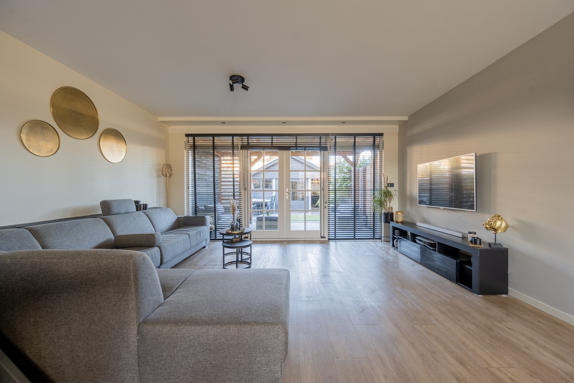 De royale woonkamer biedt volop leefruimte en is heerlijk licht. Via de openslaande deuren stap je direct de tuin in.